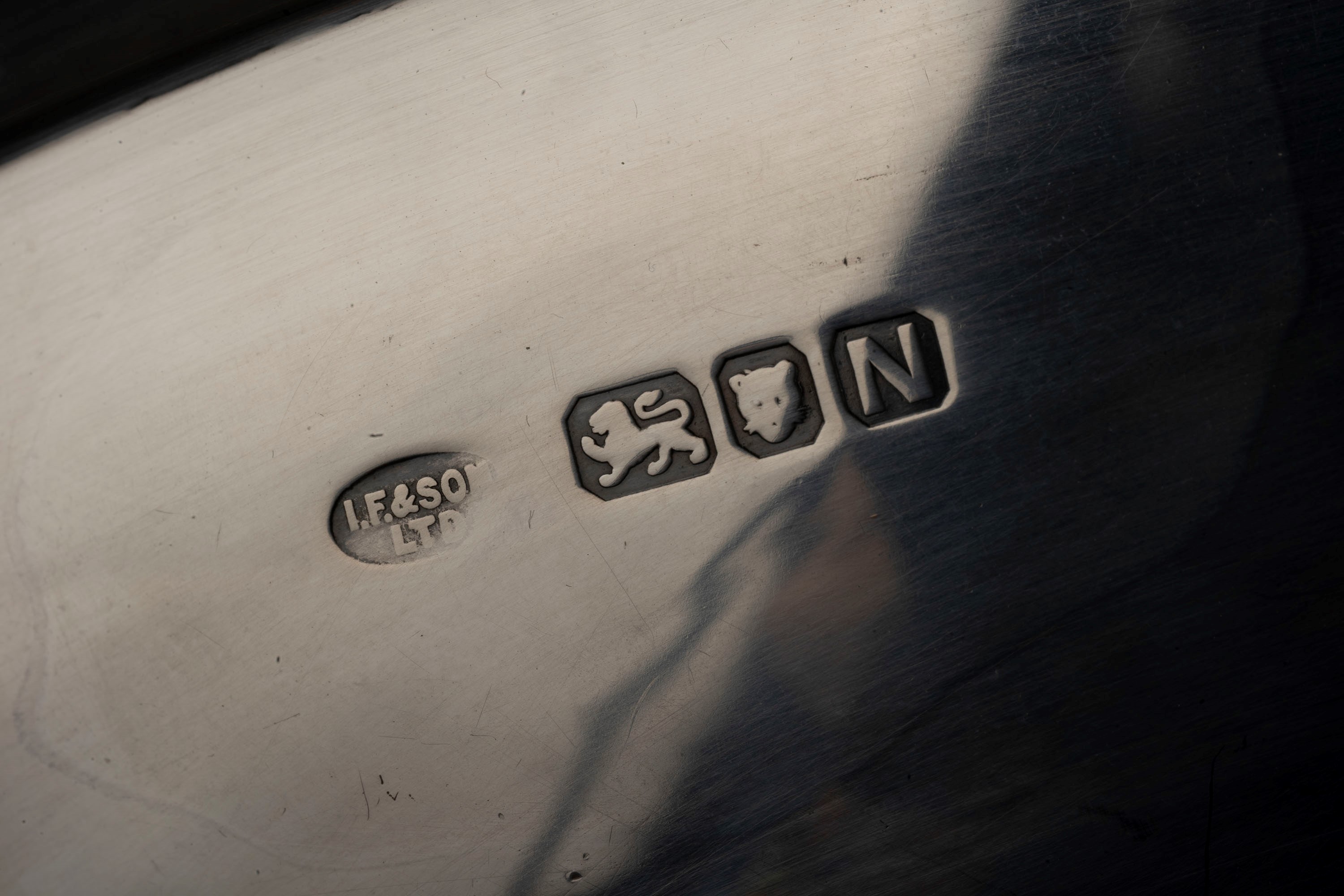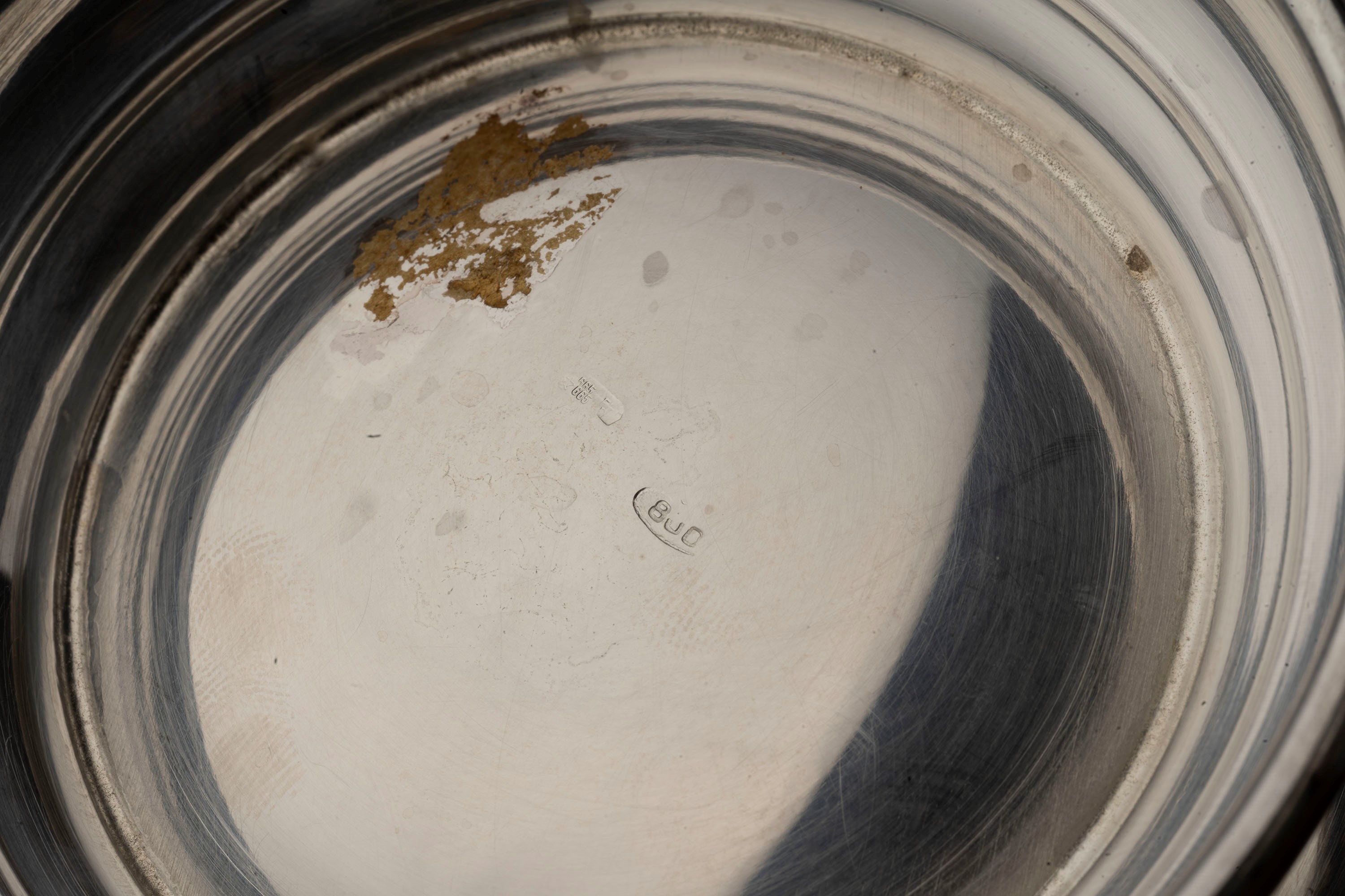 in argentoa bowl with a fluted edge, one with floral decorations resting on four feet and a mug with a smooth body and curled handle.