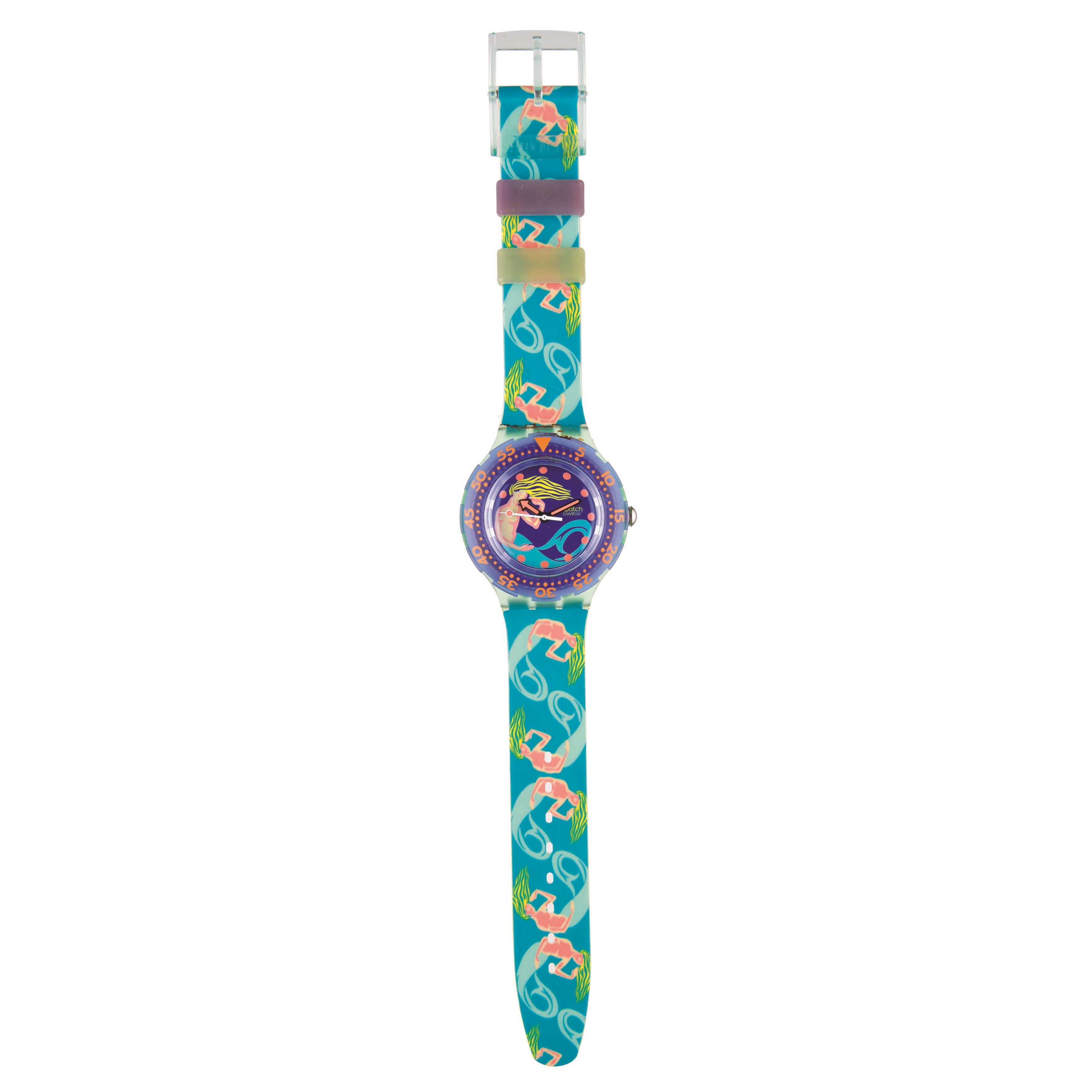 Swatch watches are presented as collector's items and are sold on a "seen and liked" basis. After 20 years both plastic and leather straps may have dried out and become too brittle to wear. Furthermore, as the mechanism and battery have not been verified, we cannot guarantee their correct functioning. We therefore suggest the potential buyer to view the lots of interest.