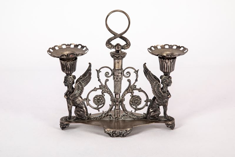 chiseled with two winged sphinxes holding candles on the sides, central part with turned handle, curly friezes and rosettes, shaped base.