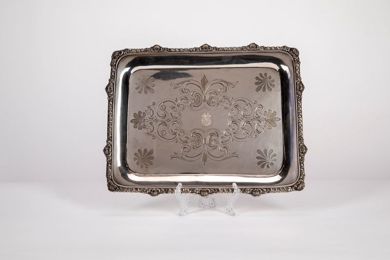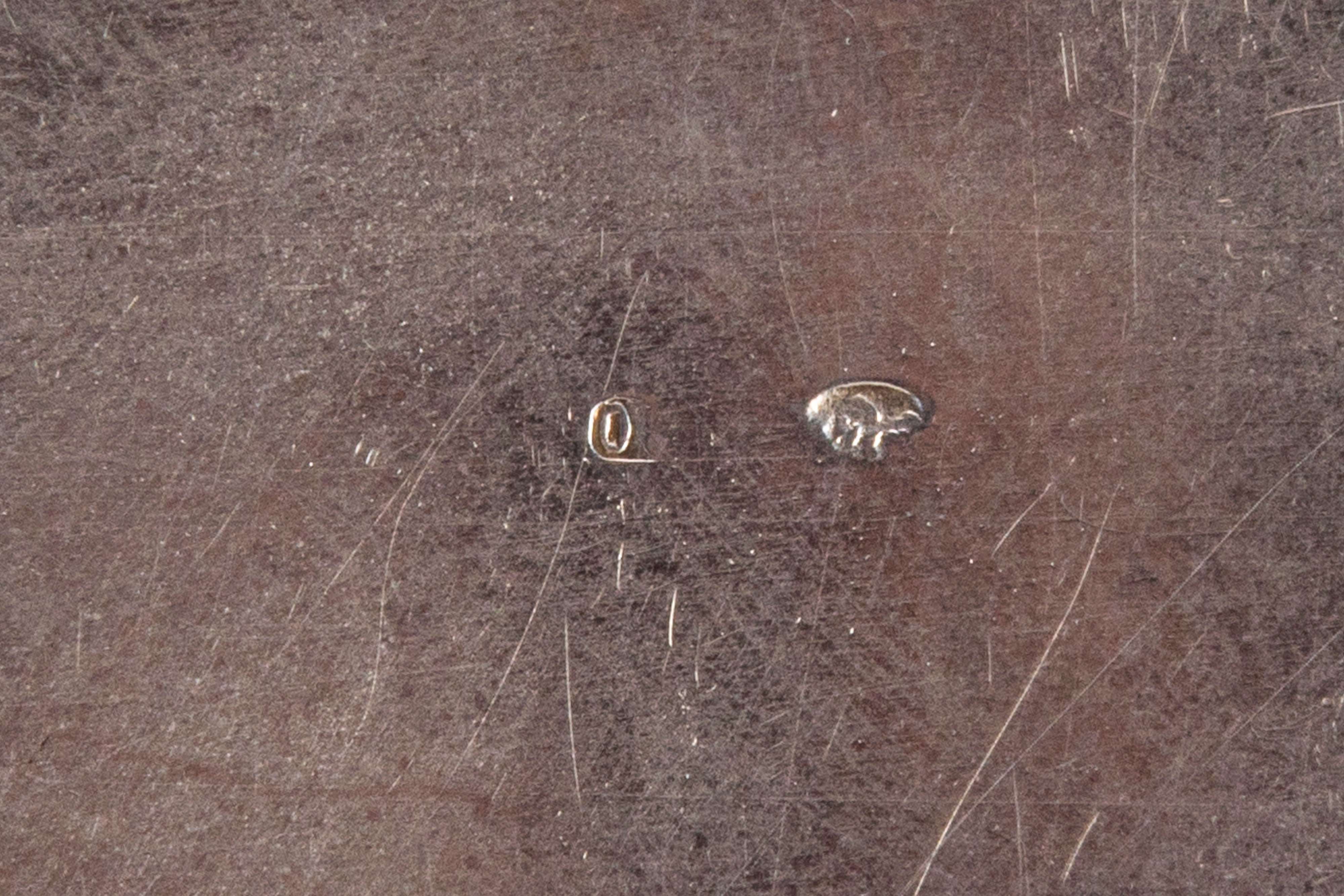 in silverrectangular in shape with a band chiseled with stylised motifs and a hollow engraved with scrolls.