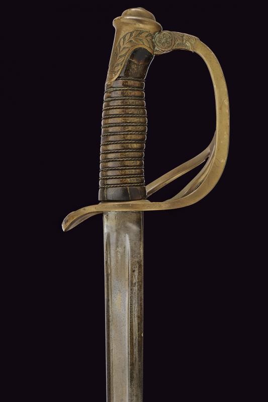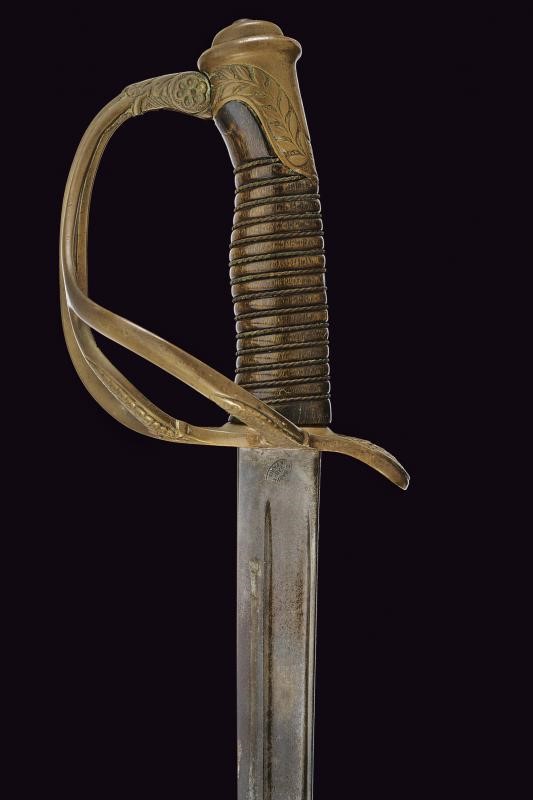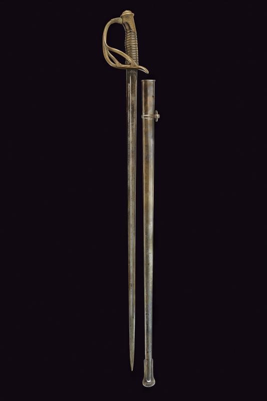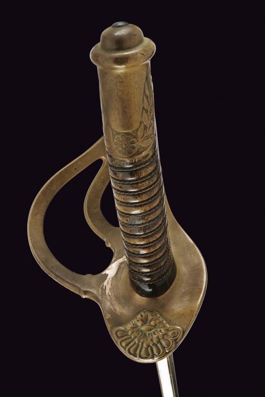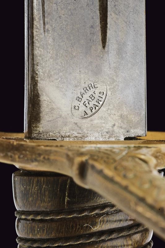 Straight, single-and-false-edged blade with deep groove, with remains of marking on the back; tang marked "C. BARRE FAB. A PARIS". Bronze hilt with three quillons and short cap; horn grip with coils and metal wire binding. Iron scabbard with a suspension ring. This lot is imported from a non-EU country and incurs additional taxes beyond the auction house commission and the V.A.T. Consequently, the total Buyer’s Premium, inclusive of all taxes, amounts to 35%.