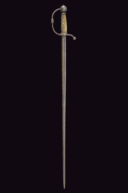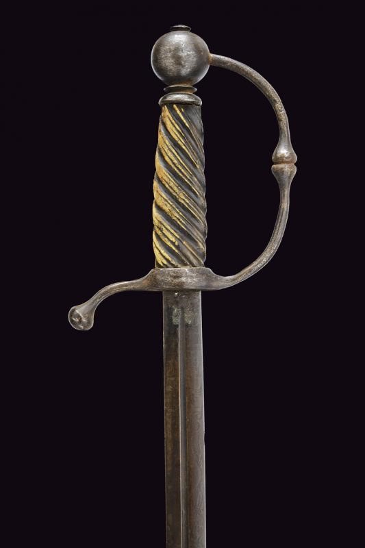 Straight blade from the second half of the 19th century, no-edged at the first part, centrally grooved and with remains of engraved floral motifs; double-edged and flat at the second part. Iron hilt with parry quillon and loop-guard in the style of the Wallonia swords, spherical pommel; grip made of carved deer horn with coils. This lot is imported from a non-EU country and incurs additional taxes beyond the auction house commission and the V.A.T. Consequently, the total Buyer’s Premium, inclusive of all taxes, amounts to 35%.