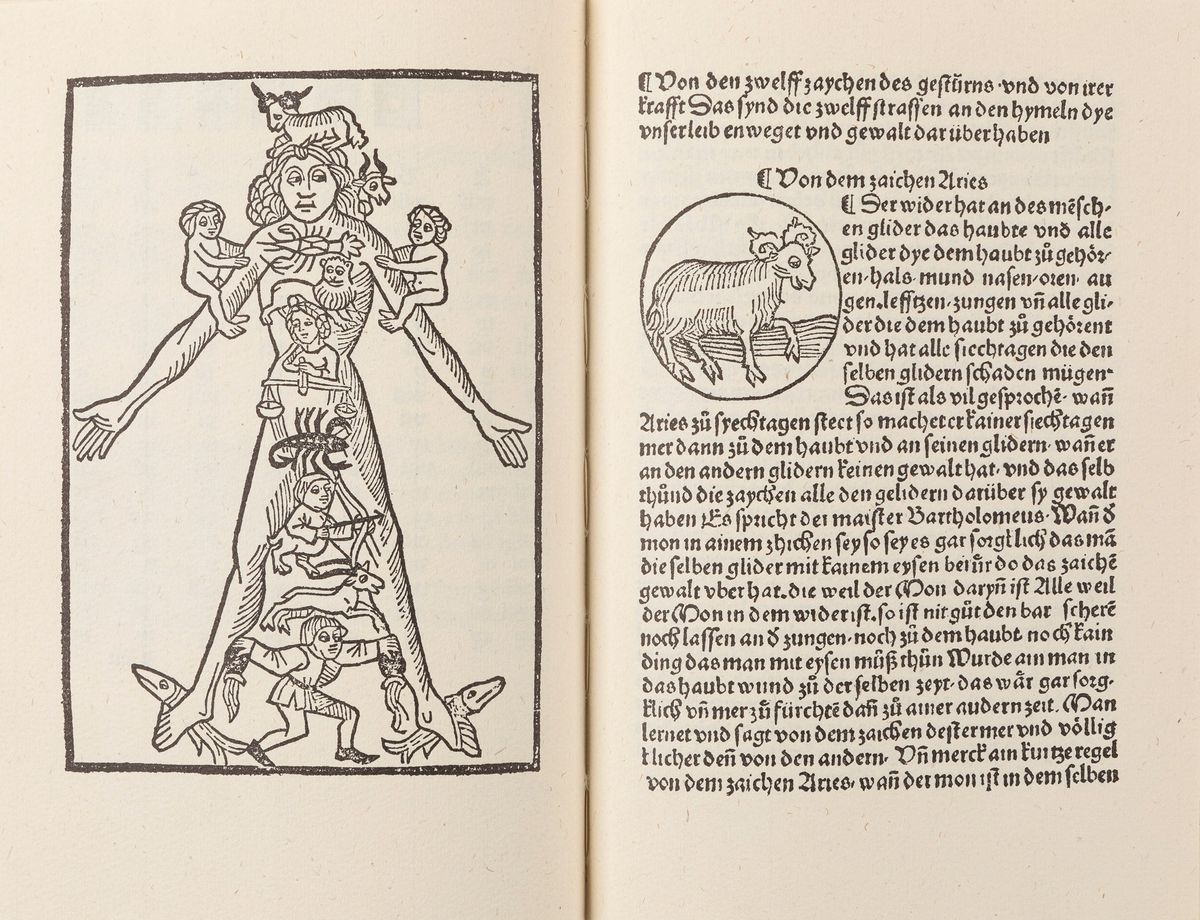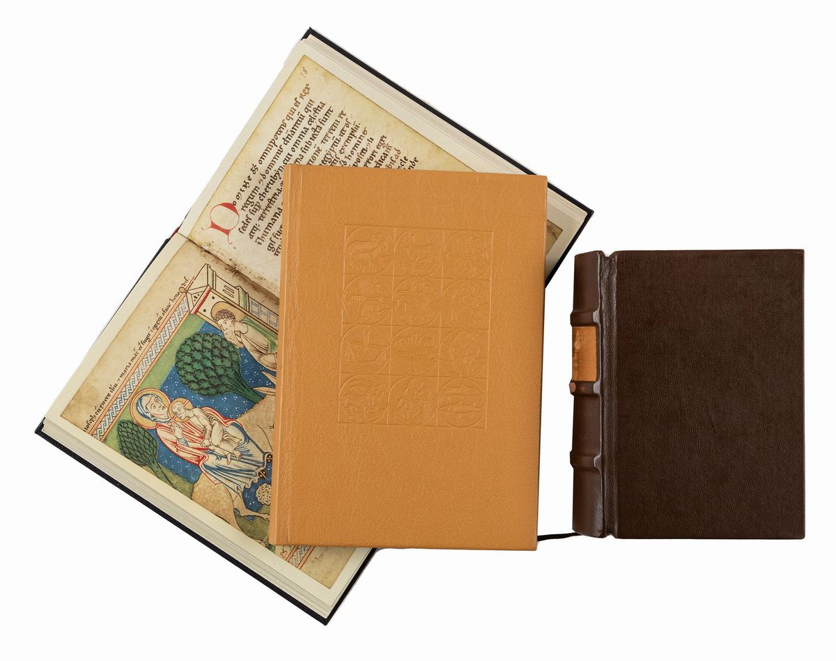 Dietikon Zurich, Verlag Drucke, 1978. 185 x 125 mm. Leather binding with imprints of the zodiac signs dry. Facsimile of the edition published in Ulm in 1498. Together in the lot the facsimile of Hildegard Gebetbuch , Codex latinus Monacensis 935 of the Bayerischen Staatsbibliothek. 172 x 115 mm. One of the 530 copies -  Das Weimarer Liederbuch . Leipzig, 1976. Facsimile of the Miscellany of religious texts preserved in Weimar, signature 14,6: 60 e. Full brown leather binding, with slipcase. Copy 382 / 750.