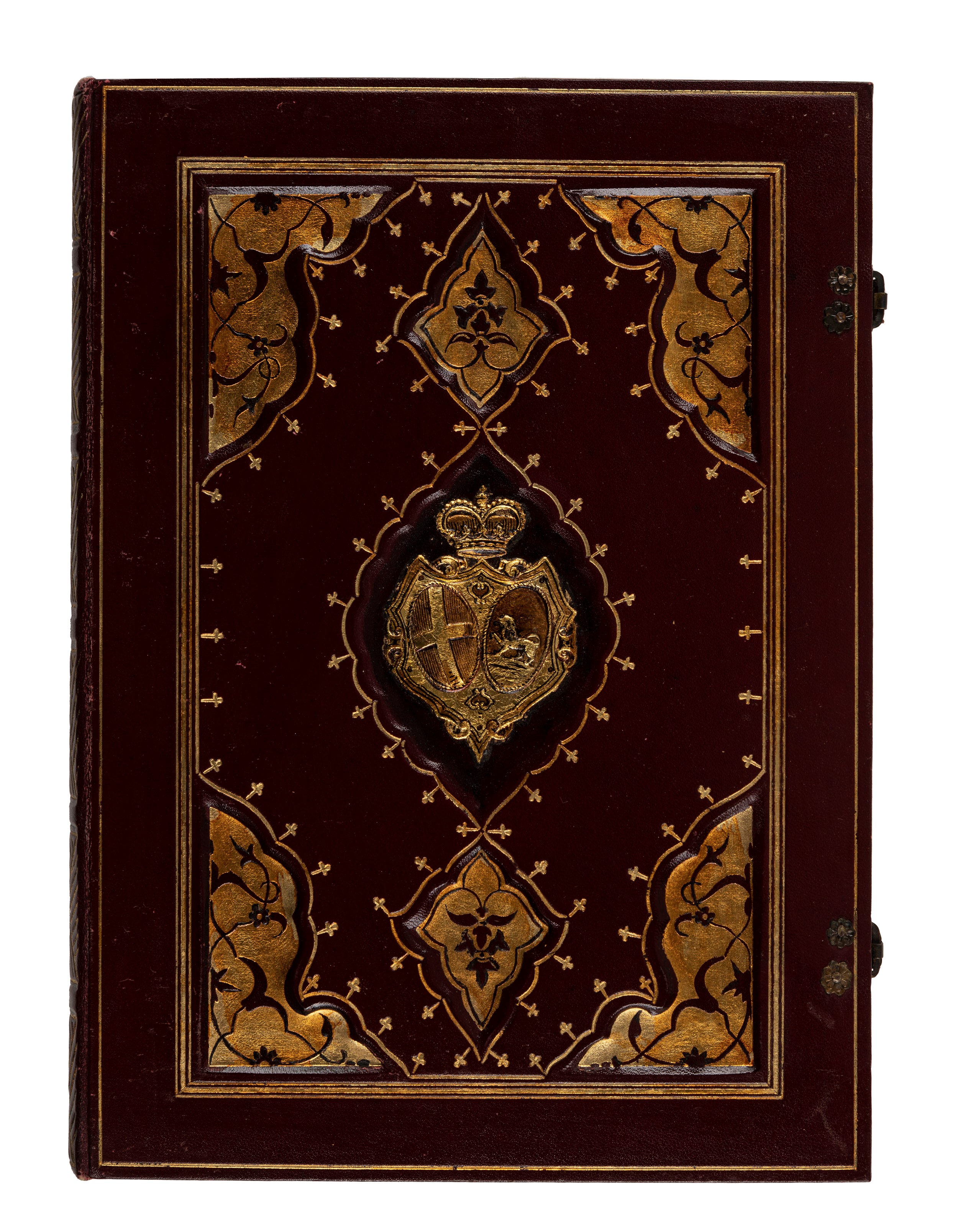 Rome-Venice, Emilian typography for Ongania, 1896. 305 x 220 mm. Bearded copy with editorial binding preserved inside a valuable "doge commission" style binding with recessed compartments, with the Savoy arms in the center.