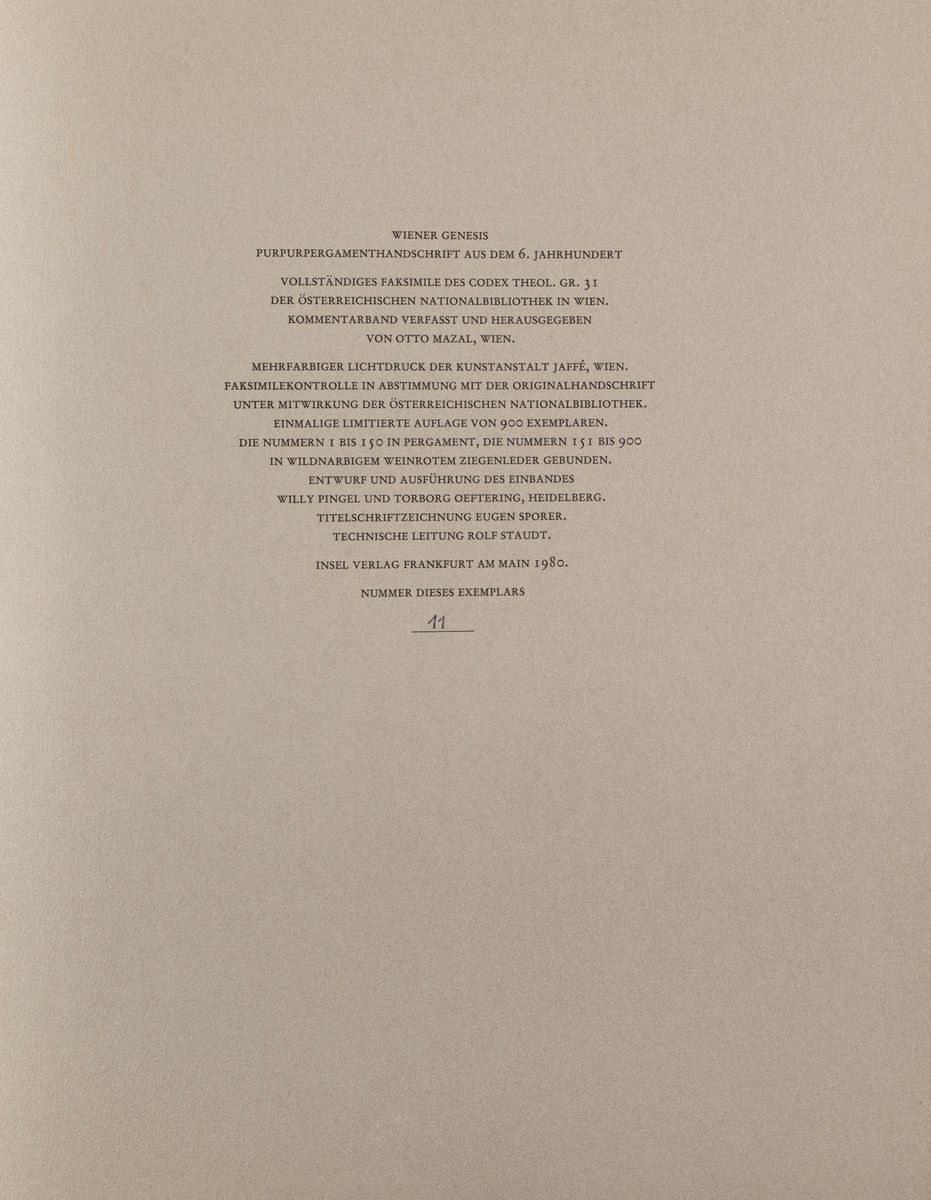 Frankfurt, Verlag, 1980. 346 x 280 mm. Full parchment binding with title on the upper plate, inside a gray canvas case. Copy 11/150 bound in parchment, within a printing run of 900 copies. Commentary by Otto Mazal.