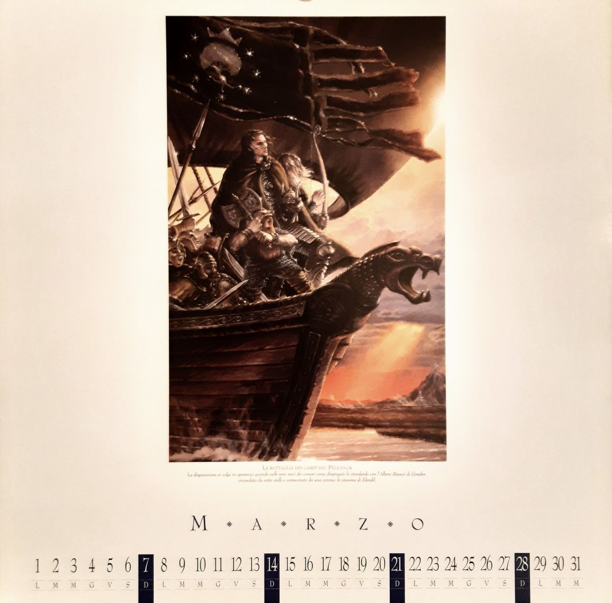 Original illustration made by Michelucci for "The Battle of the Pelennor fields", published for the first time in the famous JRR Tolkien Calendar 1999 for the month of March by Rusconi Libri in 1998. Michelucci with this calendar has established himself internationally as one of the most talented and appreciated interpreters of the Tolkenian universe. A museum piece.“Despair turns into hope when the banner with the White Tree of Gondor, surrounded by seven stars and surmounted by a crown, the coat of arms of Elendil, is unfolded on the black ships of the corsairs. " Signed, dated and titled.