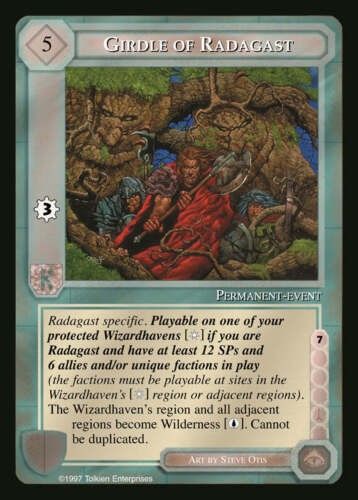 Original illustration made by Otis for the playing card "Girdle of Radagast", published in the Middle-earth Collectible Card Game (MECCG) series by Iron Crown Enterprises in 1997. MECCG was the first collectible card game based on the world of JRR Tolkien born in 1995, he had the honor of counting among his illustrators the greatest fantasy artists of the moment. Signed and dated.