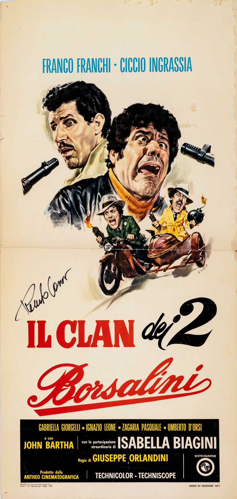 Italian first-edition movie poster (locandina) of "Il clan dei due Borsalini", directed by Giuseppe Orlandini and starring Franco Franchi and Ciccio Ingrassia in 1971. Some defects. Signed by Casaro.