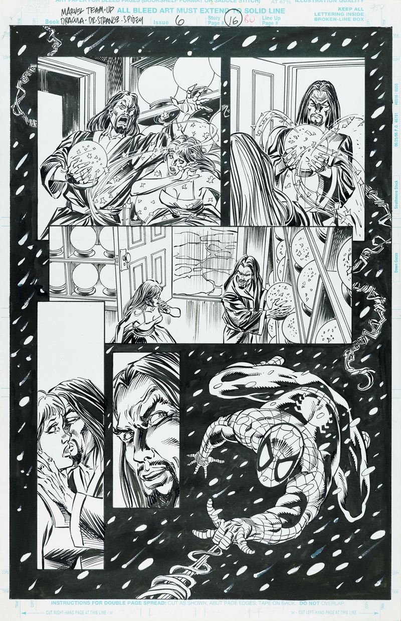 Original comic art made by McLeod for "Lost Souls," published in Spider-Man Team-Up n. 6, page 16, by Marvel in 1997. Tear in the upper left corner. Ink by Tom Palmer. Signed on the back by McLeod.