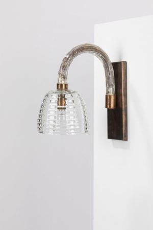 in blown glass and brass supports.
