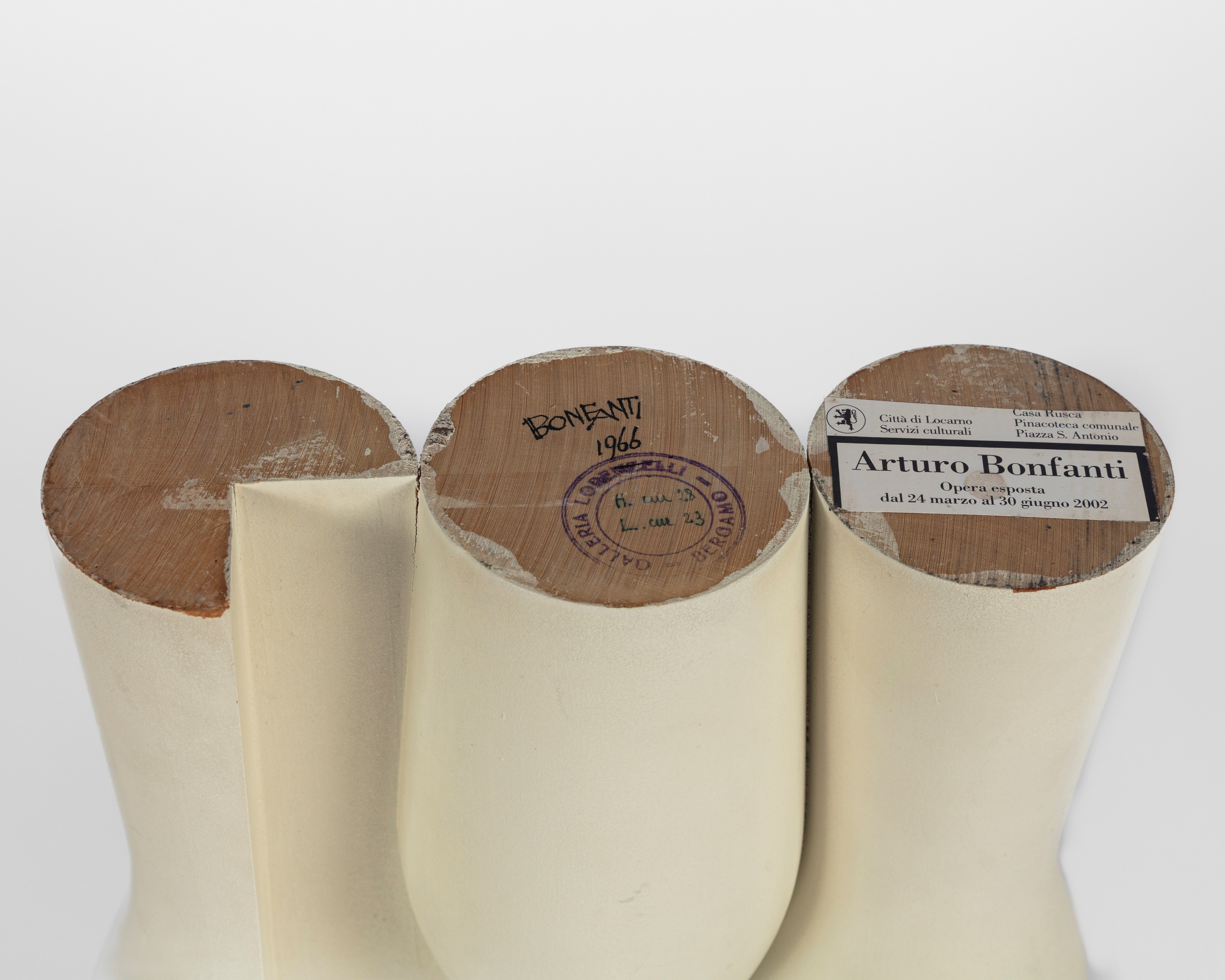 Darmstadt, Arturo Bonfanti. Intime Astrazioni 1926-1975, Institut Mathildenhole Darmstadt, July - September 2001;Locarno, Arturo Bonfanti, Casa Rusca Pinacoteca Comunale, March - June 2002 (label under the base);Bergamo, Bonfanti, pitture, disegni, sculture 1959-1966, Galleria Lorenzelli, June- July 1966