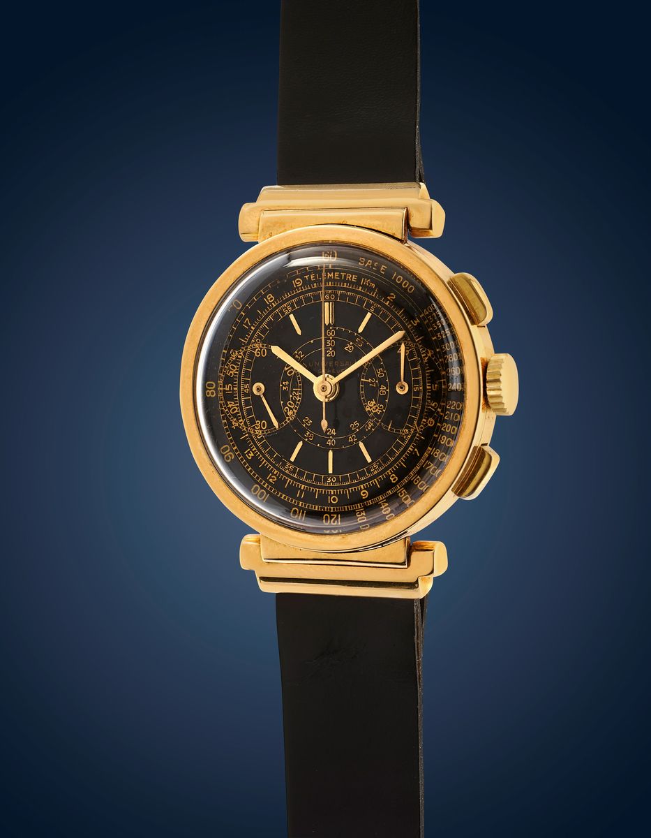 18k gold round case, n.597823, rectangular pushers, hooded lugs.