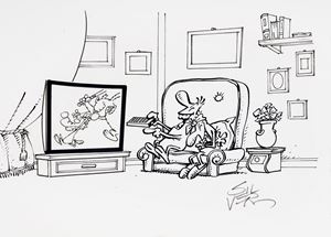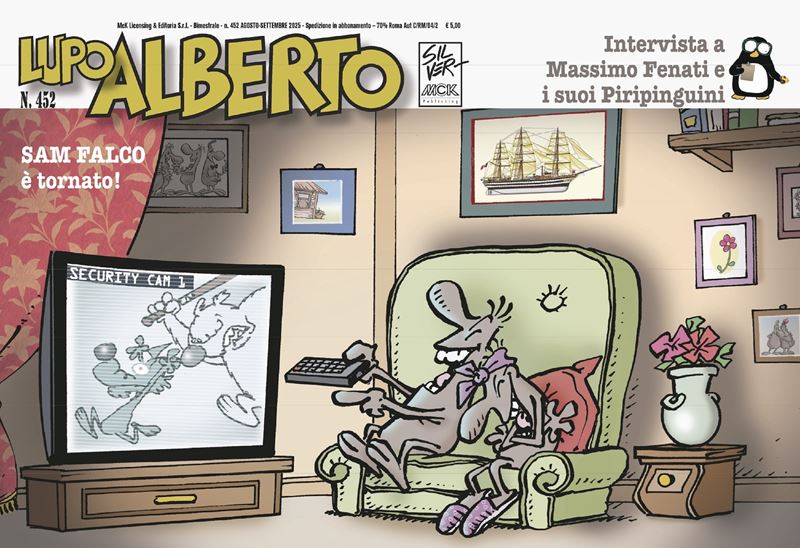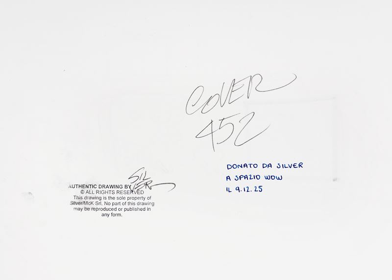 Original cover made by Silver for Lupo Alberto n. 452, published by McK in August 2025. Silver completed his apprenticeship in Bonvi's studio, where he worked on already well-known characters such as Nick Carter, Cattivik, and Capitan Posapiano. A turning point came in 1974: he debuted a comic strip of his own invention in Corriere dei Ragazzi, featuring farm animals. Although the first strip featured a rooster, a friendly blue wolf immediately stole the show, thus beginning the forty-year success of Lupo Alberto. This is the first time a highly rare Lupo Alberto cover is on the market. Signed on the front, signed and stamped on the back.