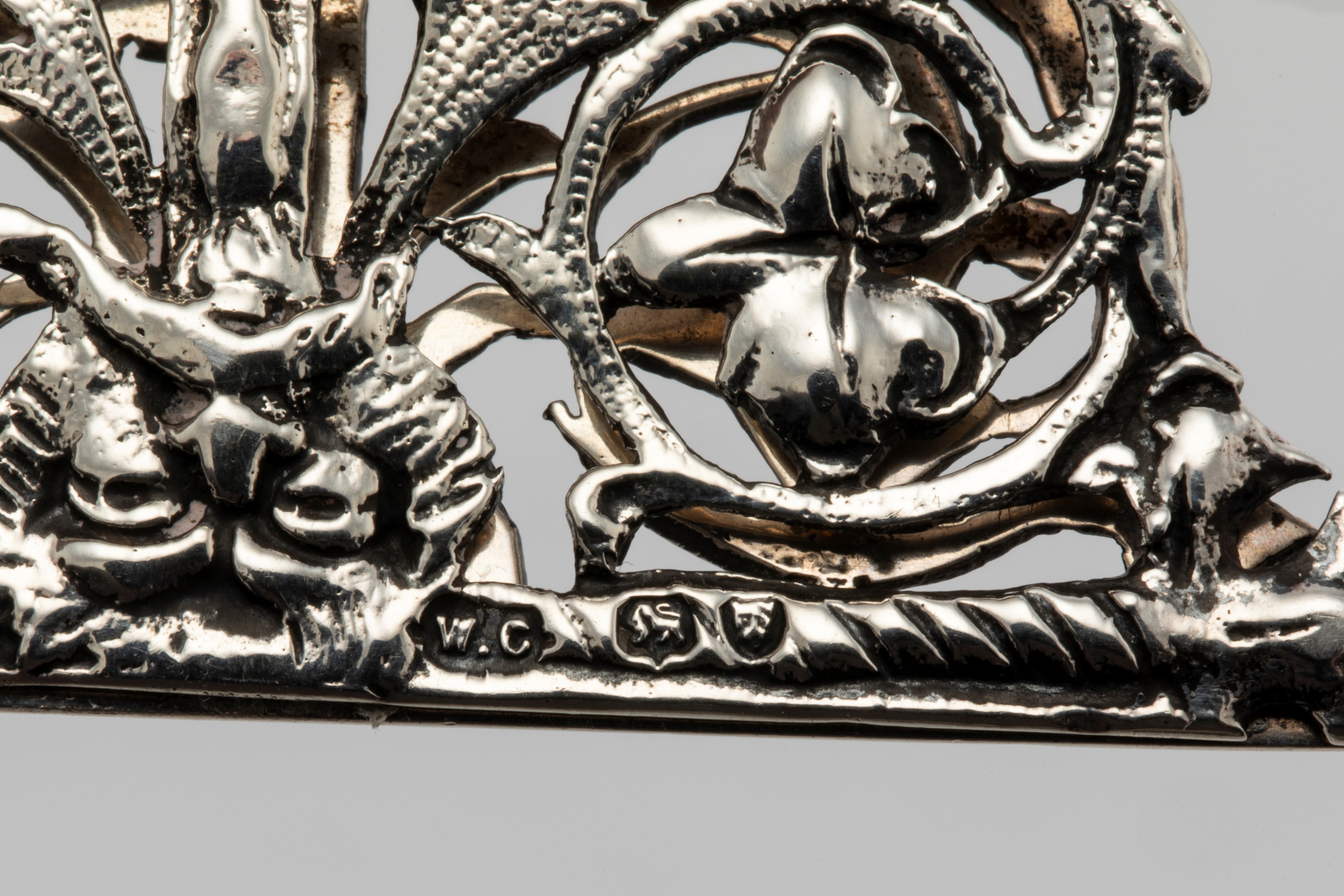 in 925 silverThe Victorian Silversmith's Paperweight WC (William Comyns & Sons?) London 1888; the buckle with worn silversmith's marks which are difficult to read, Birmingham 1897, both perforated with phytomorphic motifs.