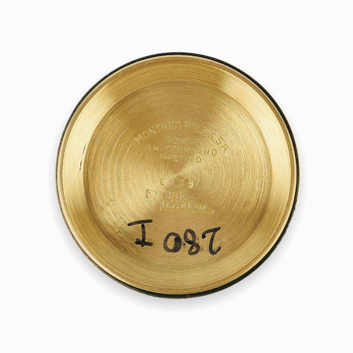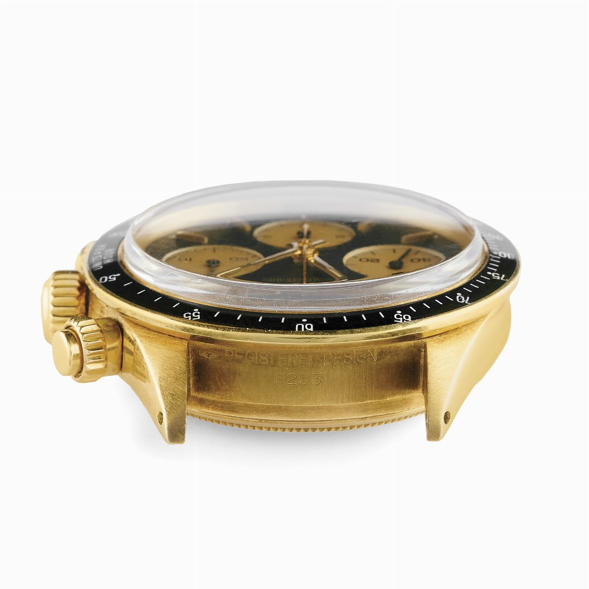 seriale n 23xxxxx, cassa rotonda in oro giallo 18K, quadrante di colore nero con contatori a contrasto (champagne), grafica in oro e indici applicati (non coevo ed epoca successiva). Tasti della cronografia a vite (non coevi ed epoca successiva), ghiera tachimetrica con inserto in plastica nero e scale tachimetrica con misurazione della velocità fino a 200 unità per ora MKI (prima serie coeva), fondello a vite ref. 6239 (corretto e coevo), modello transizionale, vetro in esalite. Movimento a carica manuale, calibro 727, numero movimento 1293 ( corretto e coevo), bracciale oyster in oro giallo 18K rivettato con chiusura a scatoletta.