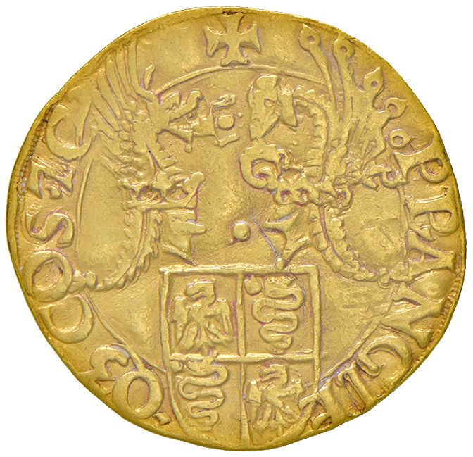 Doppio ducato, con busto del duca a d., e stemma di Milano sormontato da due elmi con cimiero. Crippa 1. MIR 215/1. ORO, gr. 6,91. Molto raro. Lievi ondulazioni. Una delle più prestigiose monete rinascimentali con ritratto. BB