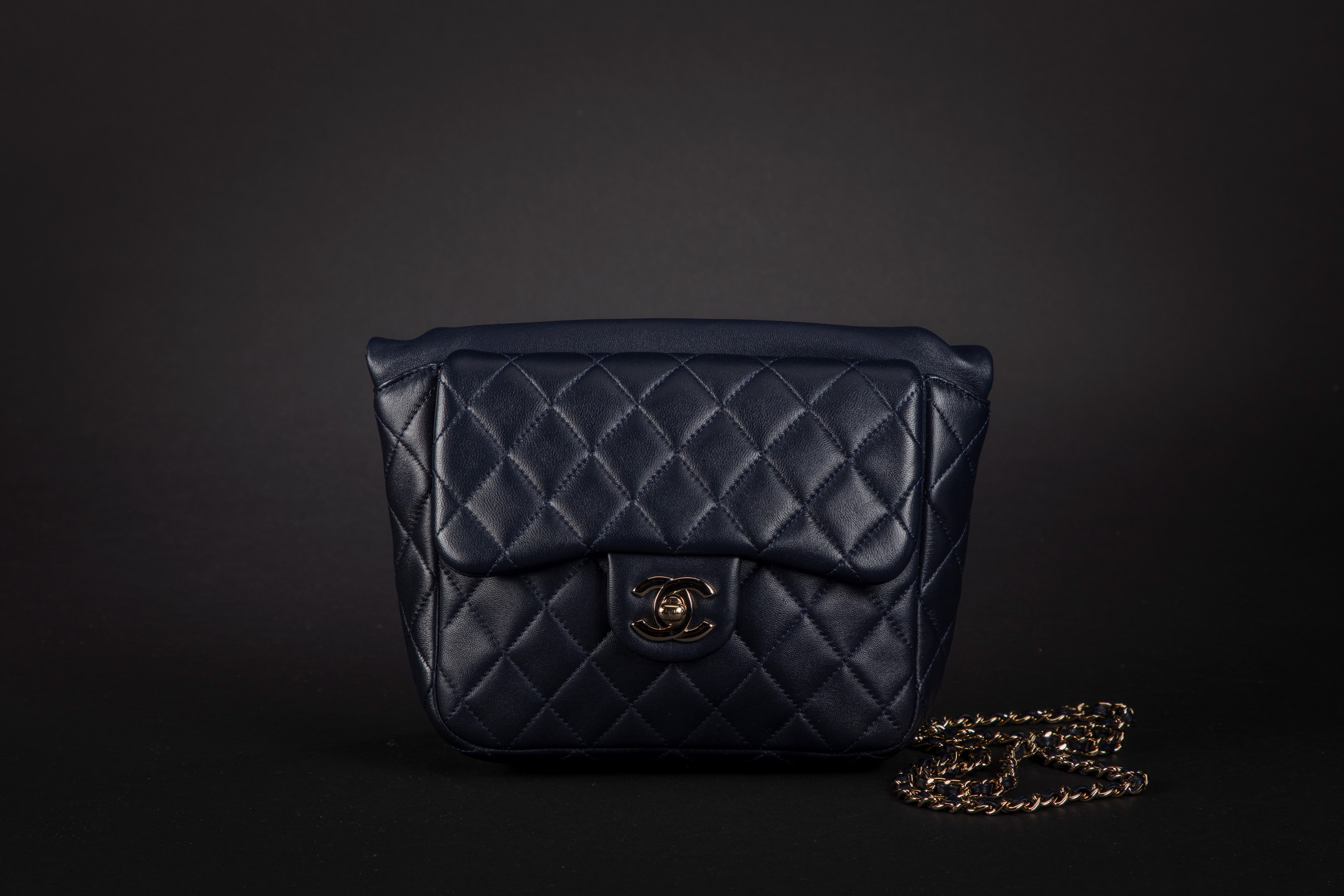 Cm 18In pelle color blu, matelassé, dettagli a catena in metallo dorato, con sacchetto, 2015