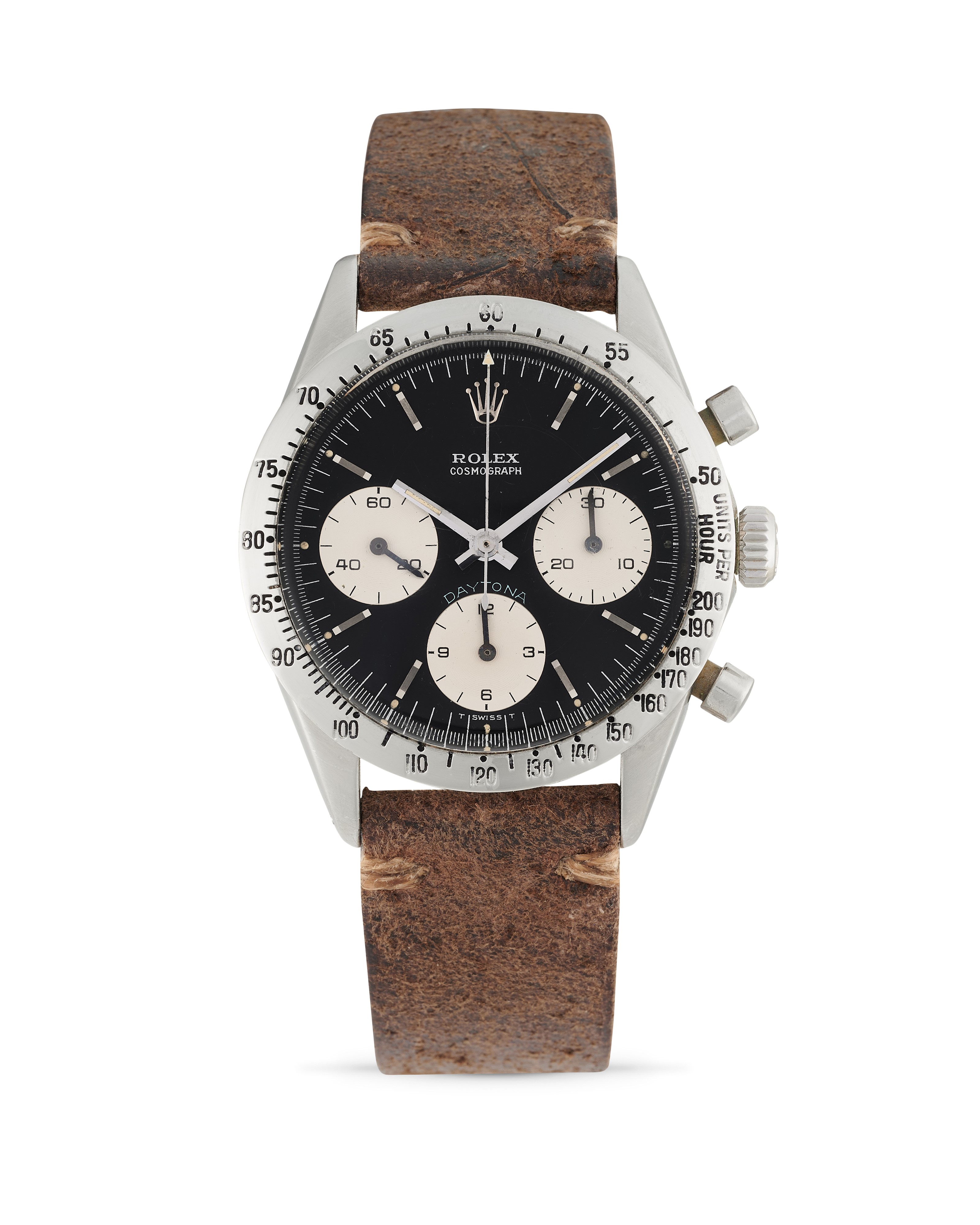 La referenza 6239 fu il primissimo Cosmograph Daytona presentato da Rolex, lanciato nel 1963 e in produzione fino a circa il 1972. Fu il primo cronografo Rolex con la scala tachimetrica incisa sulla lunetta. L’orologio in catalogo rappresenta una delle versioni più rare, con la scritta Daytona dal colore azzurro: un difetto nel pigmento ha fatto virare la scritta Daytona, originariamente stampata in bianco, verso un attraente colore azzurro, un fenomeno che si è verificato solo in esemplari con seriale vicino ai 2 milioni.