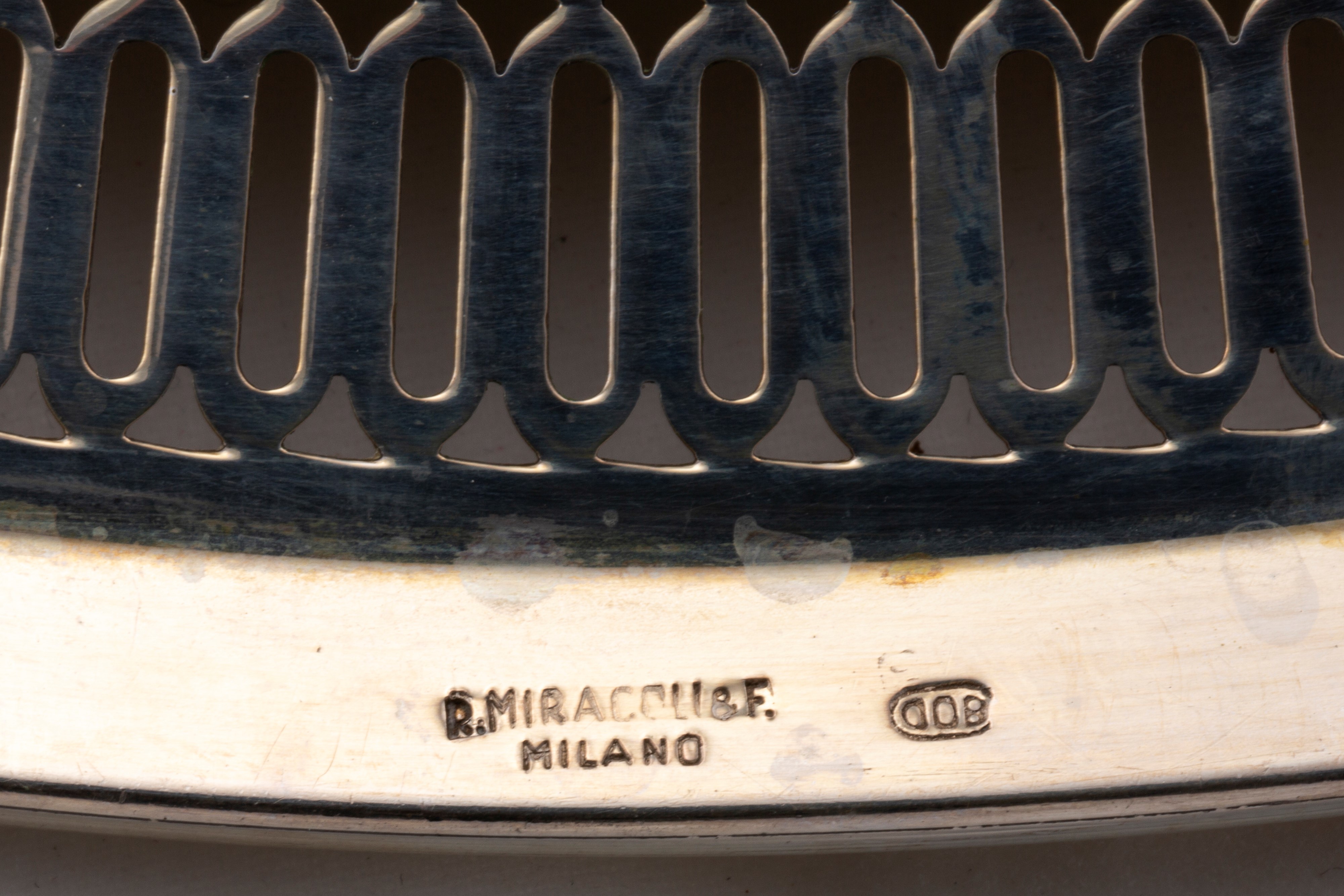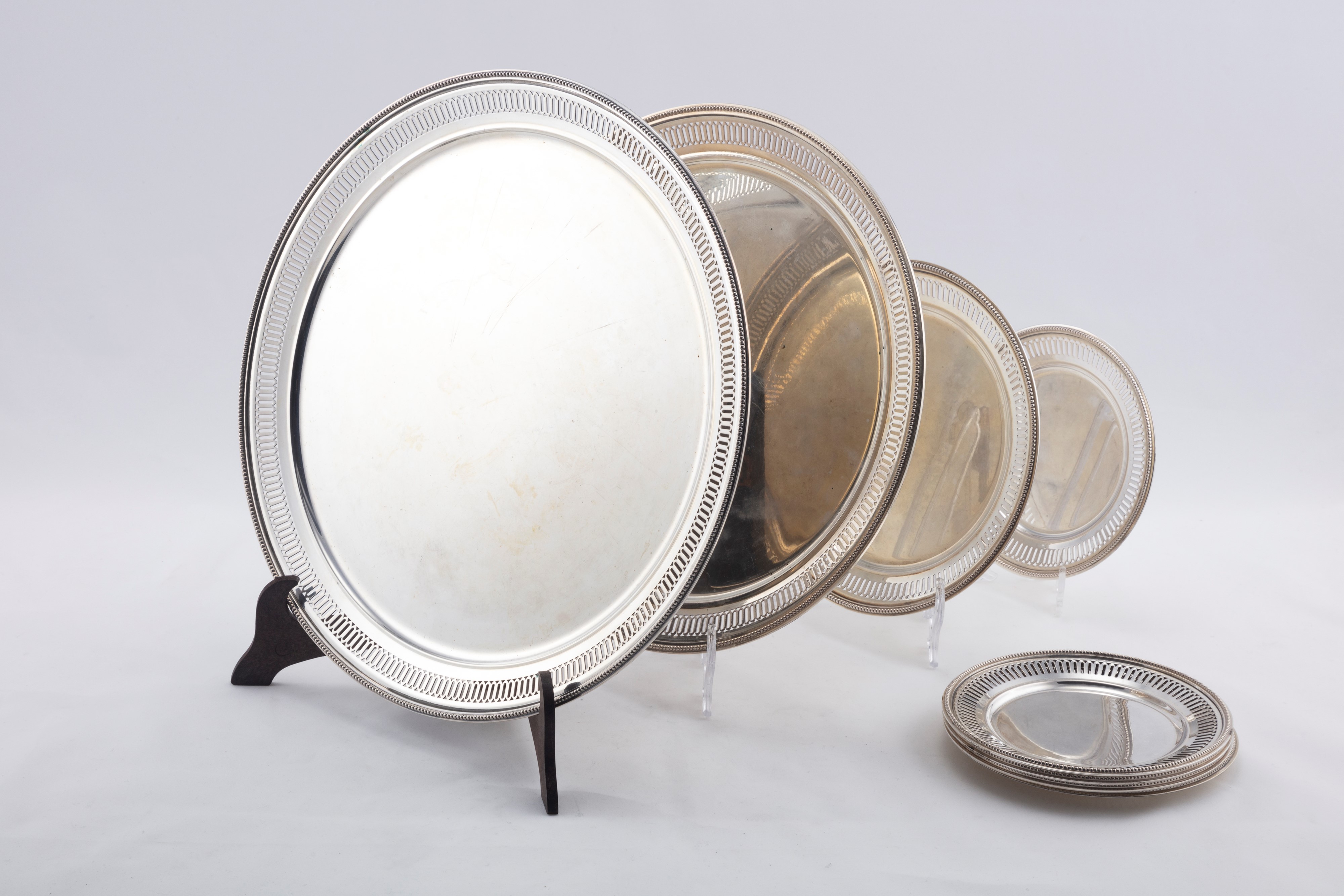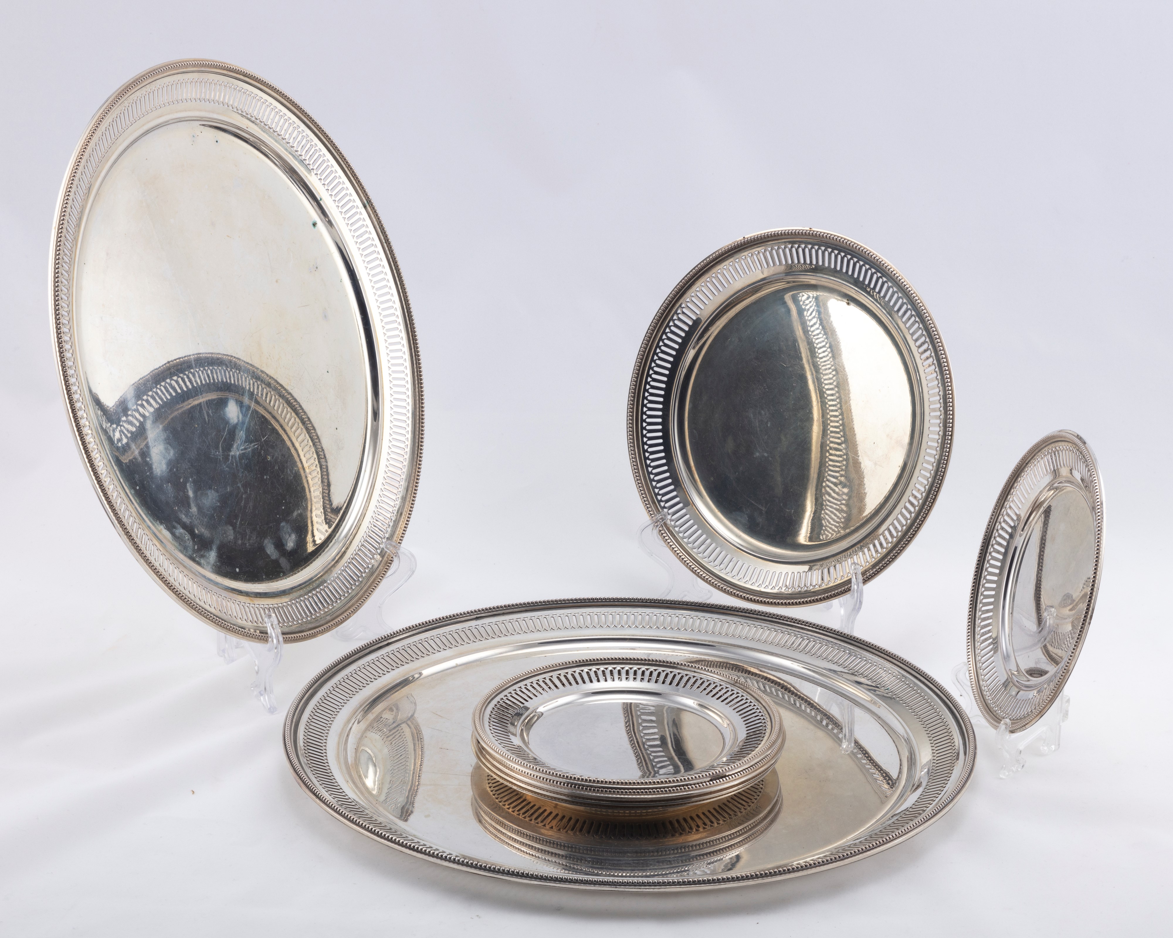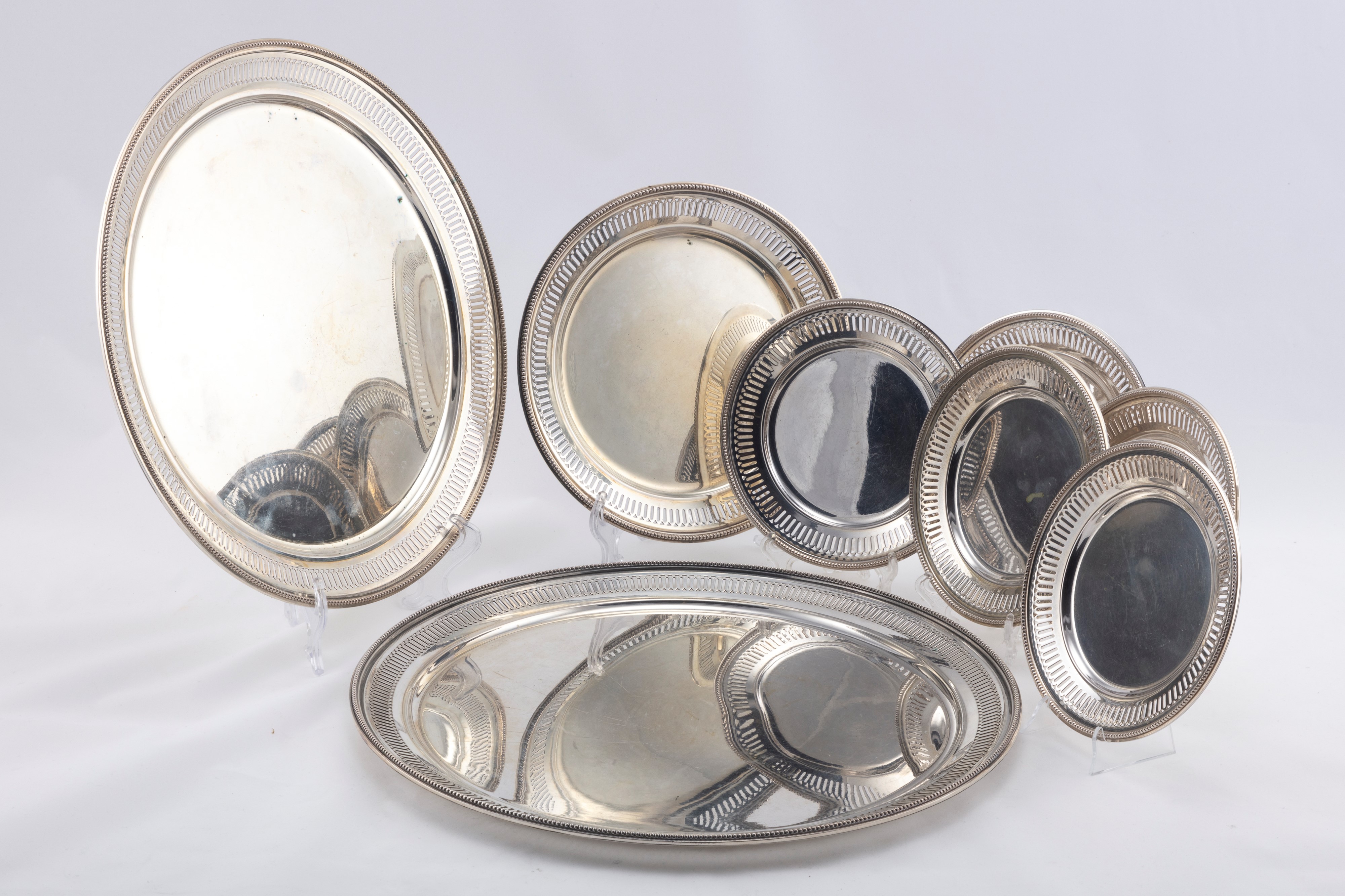 in argentocomposto da due sottopiatti, cinque piattini pane e uno da dessert, a profilo liscio, con bordo scanalato, i due più grandi recano punzone Miracoli Milano (d cm 34,80 e 31,00), i piattini di manifattura artistica milanese (d cm 15,50 e 21,00).