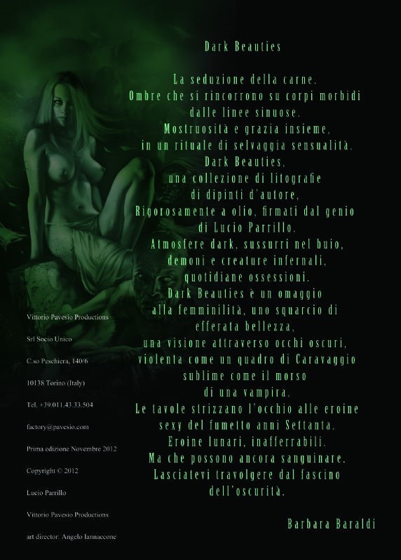 Dipinto originale realizzato da Parrillo come omaggio a Cimiteria, la affascinante zombie protagonista dell'omonima serie tra le più celebri del fumetto erotico tascabile italiano. Opera pubblicata sul portfolio "Dark Beauties" da Pavesio Editore nel 2012. << La seduzione della carne, ombra che si rincorrono su corpi morbidi dalle linee sinuose. Mostruosità e grazie insieme, in un rituale di selvaggia sensualità. Dark Beauties è un omaggio alla femminilità, uno squarcio di efferata bellezza, una visione attraverso occhi oscuri, violenta come un quadro di Caravaggio sublime come il morso di una vampira. >> Fori di affissione ai margini. Firmato e datato al fronte e al retro.