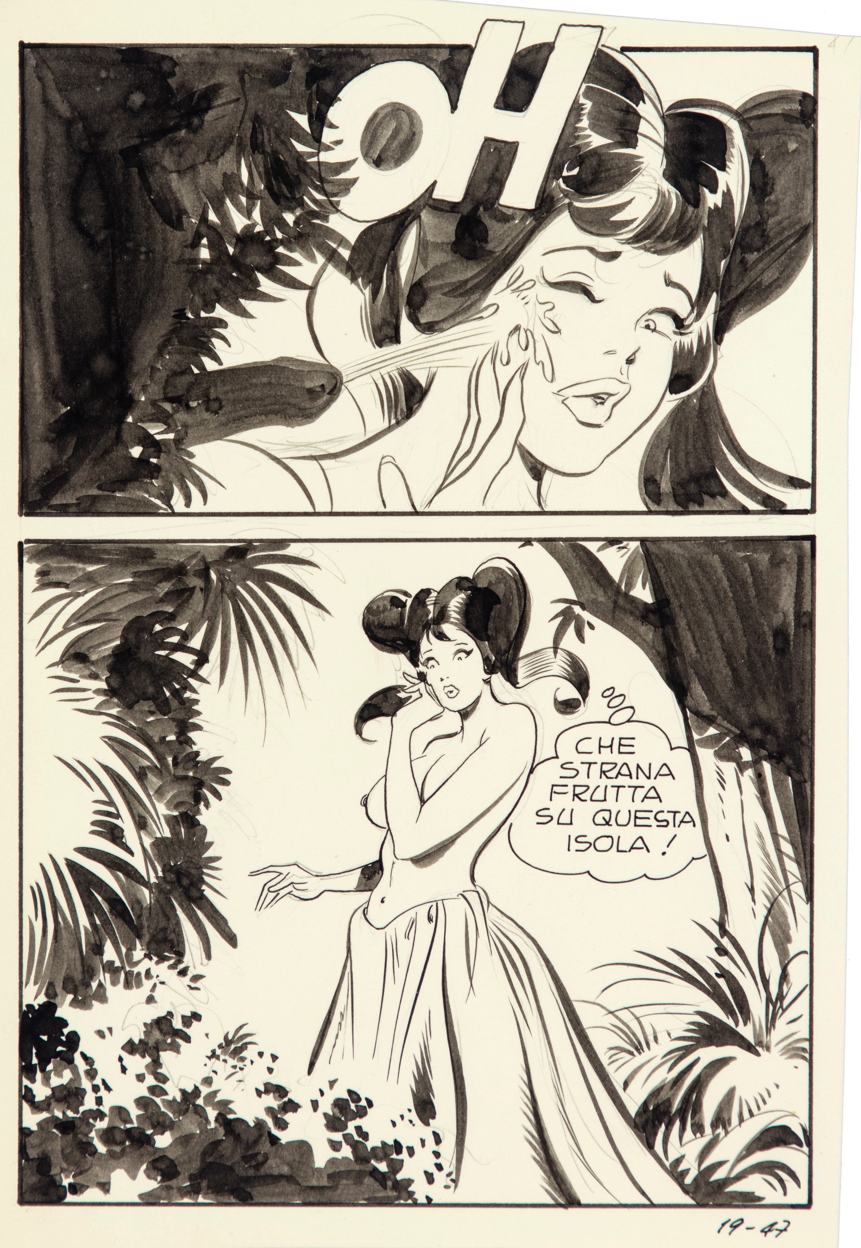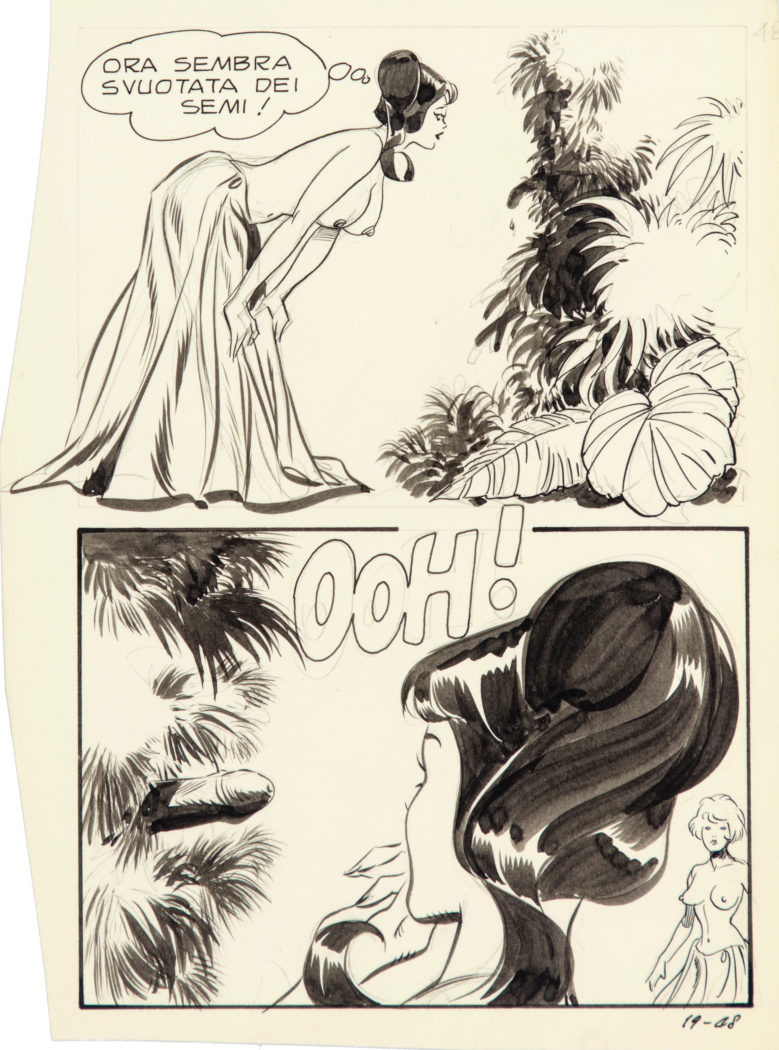 Lotto composto da 3 tavole originali realizzate da Frollo per "Robinson Culoè", edite su Biancaneve n. 19 alle pagg. 46, 47, 48 dalla Edifumetto nel 1974. Basata sull'omonima fiaba, la serie racconta le avventure sessuali di Biancaneve in un mondo di principi, regine e mostri, riuscendo a restare vergine sotto continui assalti sessuali per i primi quattro episodi, per poi divenire la principessa del sesso libero e gioioso per tutti. A dieci anni esatti dalla nascita di Diabolik e del fumetto nero, si consuma nelle edicole italiane una nuova rivoluzione, da una intuizione di Renzo Barbieri nasce "Biancaneve", suscitando grande scalpore e sconcerto sull'opinione pubblica. "Biancaneve" rivoluzionerà il modo di intendere e usufruire del fumetto, stravolgendo i luoghi comuni e gli stereotipi della società dell'epoca, inserendo nelle storie una provocante satira sociale e una, non velata, denuncia alla società bigotta, moralista e conservatrice, creando così un nuovo genere: le Sexy Favole per adulti.