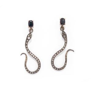 in oro giallo 18k e argentodecorato con diamanti taglio brillante, orecchini pendenti con chiusura perno e farfalla.