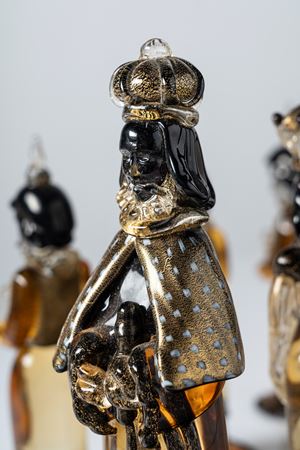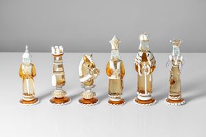 Raro set di scacchi composto da 32 elementi in vetro massiccio color ambra, finiture in pasta di vetro bianca o nera e decoro a foglia oro