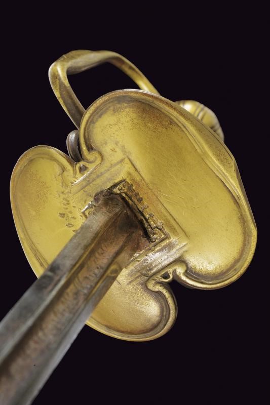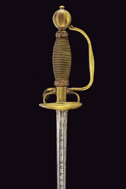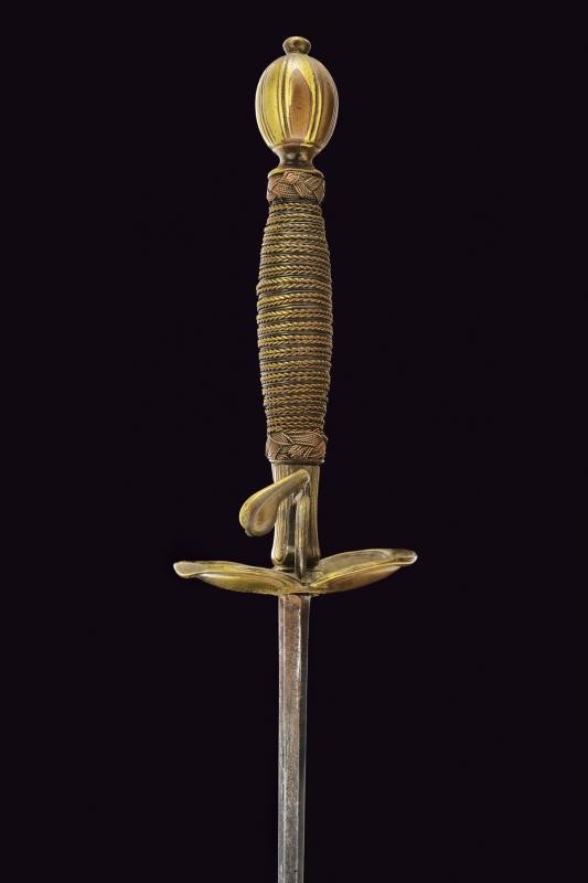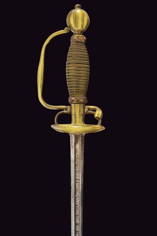 Lama dritta a sezione di losanga, profondamente sgusciata al forte e marcata su entrambe le facce "EN TOLEDO". Fornimento in ottone. Coccia a due valve lisce, una con lieve difetto al bordo. Blocchetto decorato a scanalature longitudinali, così come il pomo. Elso e guardia lisci. Impugnatura con teste di moro in filo di rame e rocchetto in filo di ferro e trecciole in rame.