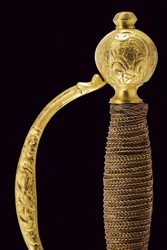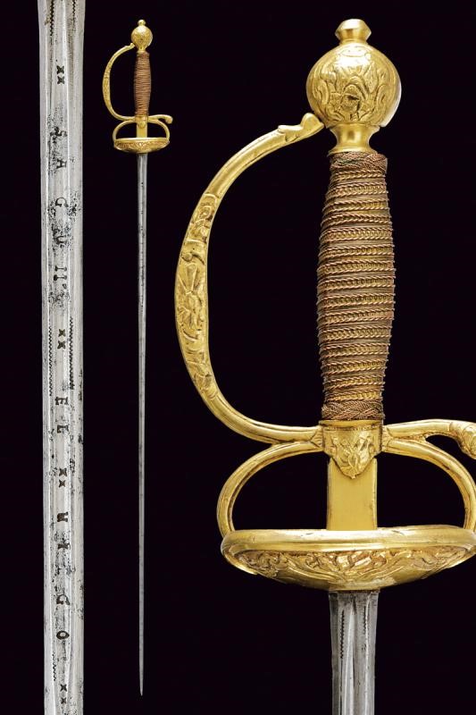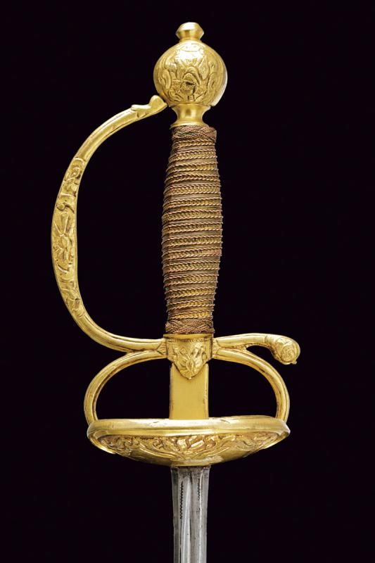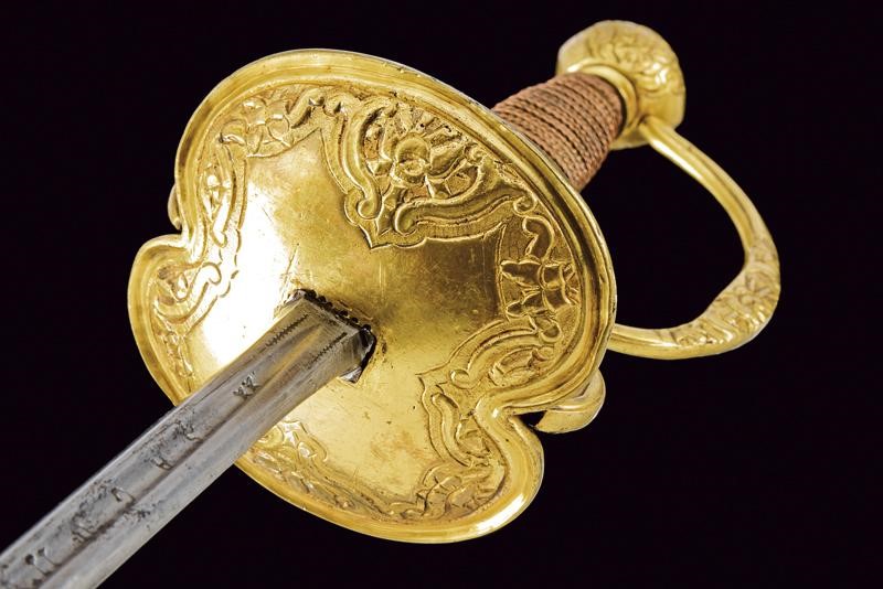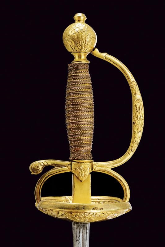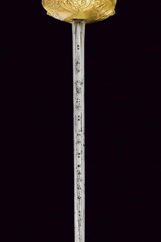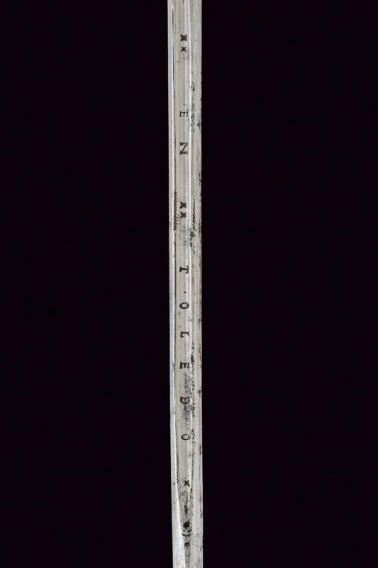 Lama dritta a due fili, con sguscio al forte recante iscrizione "SAGUM EL VIEGO / EN TOLEDO". Fornimento in metallo dorato, coccia con intagli (interni ed esterni) al bordo a motivi geometrici e floreali; massello liscio, due archetti. Pomo di forma sferica con decori en suite. Impugnatura rivestito da trecciola e con teste di moro in filo di rame, le trecciole suddivise da una banda in metallo con sferette leggermente sbalzate.