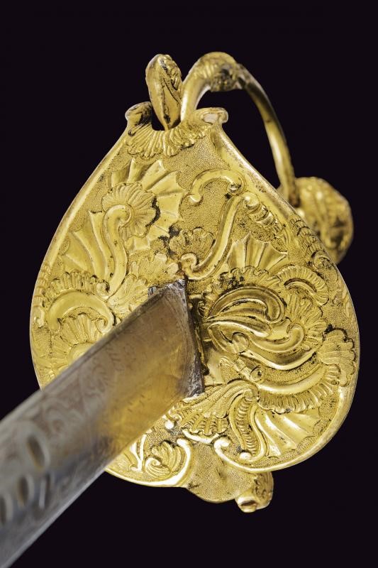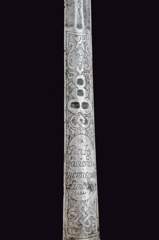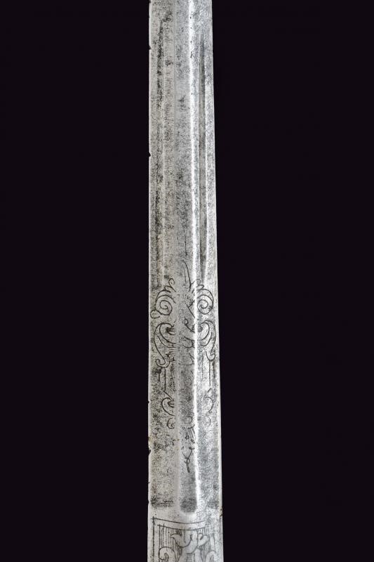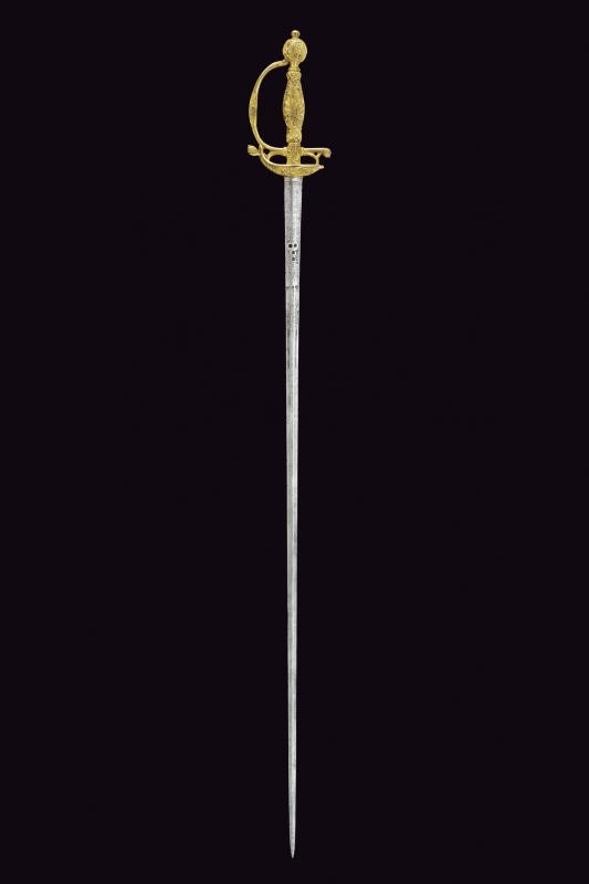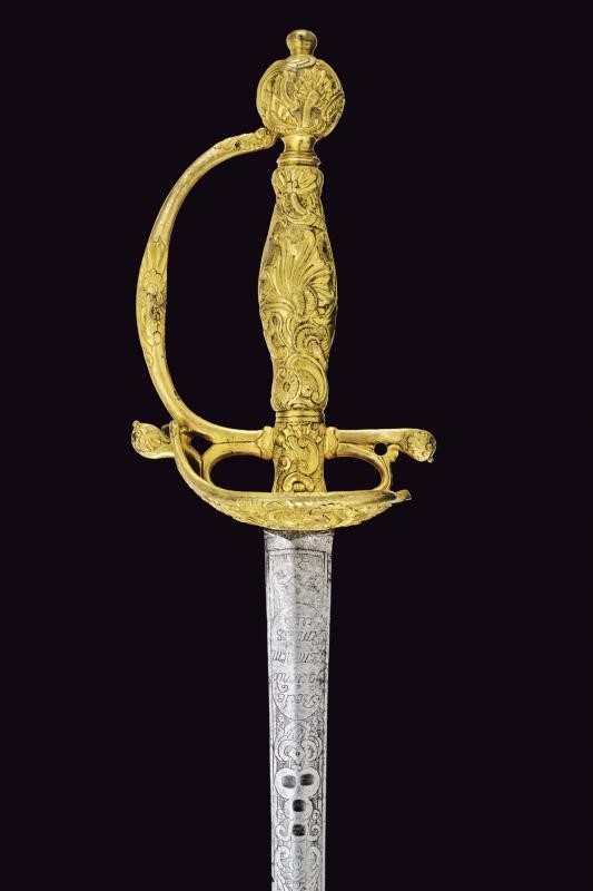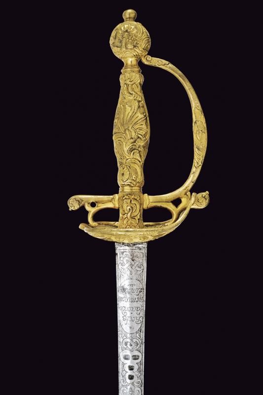 Lama dritta di sezione esagonale, recante al forte resti di incisioni a motivi floreali e architettonici. Alla base, su entrambe le facce, il motto "Recte faciendo neminem timeas" (agendo nel giusto non hai da temere nessuno). Bel fornimento in bronzo ornato in bassorilievo con decori a rocaille e volute. La finitura dorata a fuoco, ben conservata. Nel tipico gusto rococò.