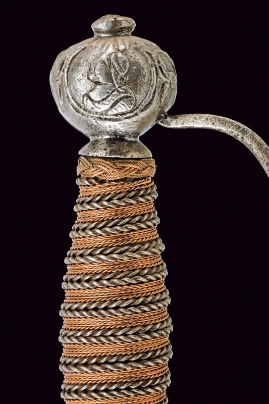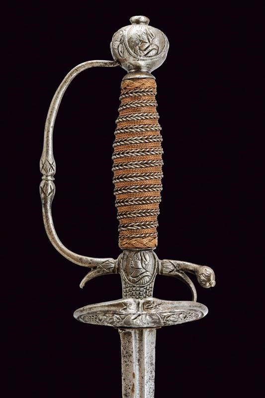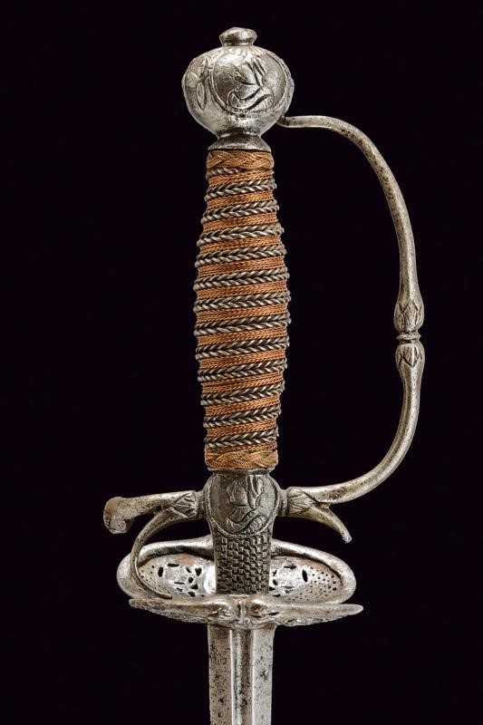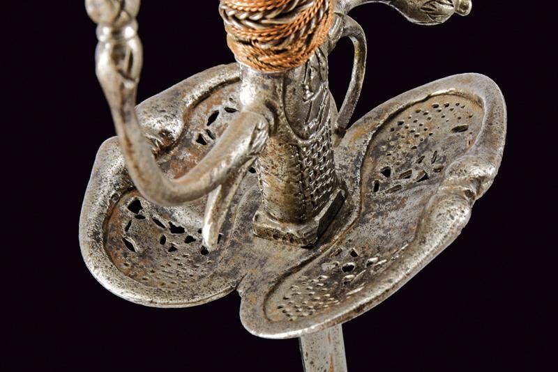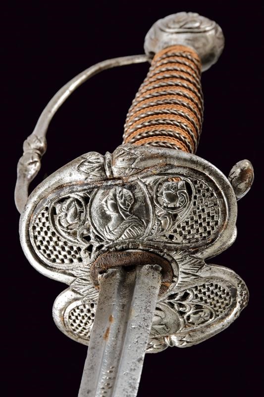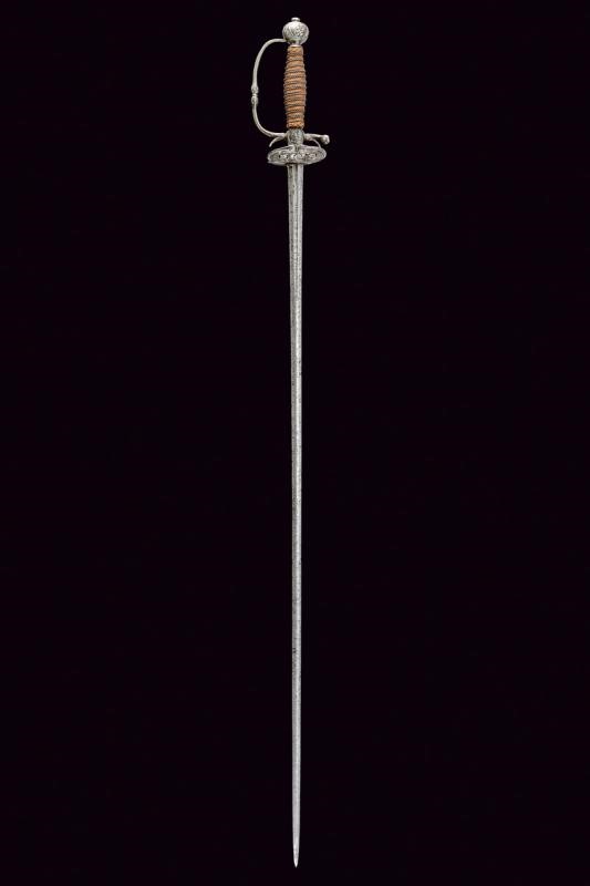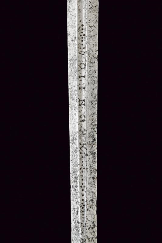 Lama dritta di sezione lenticolare, alla base sguscio recante iscrizione "SOLINGEN" (sul lato opposto un'altra iscrizione, poco visibile). Bel fornimento in ferro, coccia messa a giorno e decorata con busti e volti, questa iconografia è ripresa, priva di traforo, anche al massello e al pomo, quest'ultimo di forma sferica schiacciata; braccio di parata angolato e con testa a goccia. Uno dei due archetti con rottura; guardia ingrossata al colmo. Impugnatura rivestita con trecciola e dotata di teste di moro in filo di ferro e rame.
