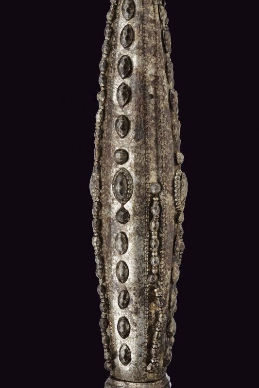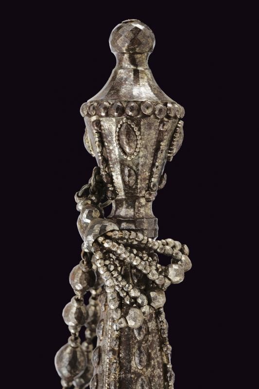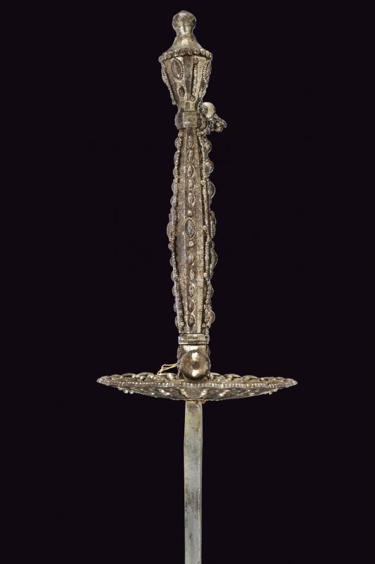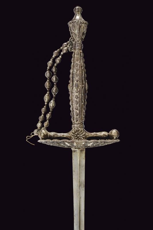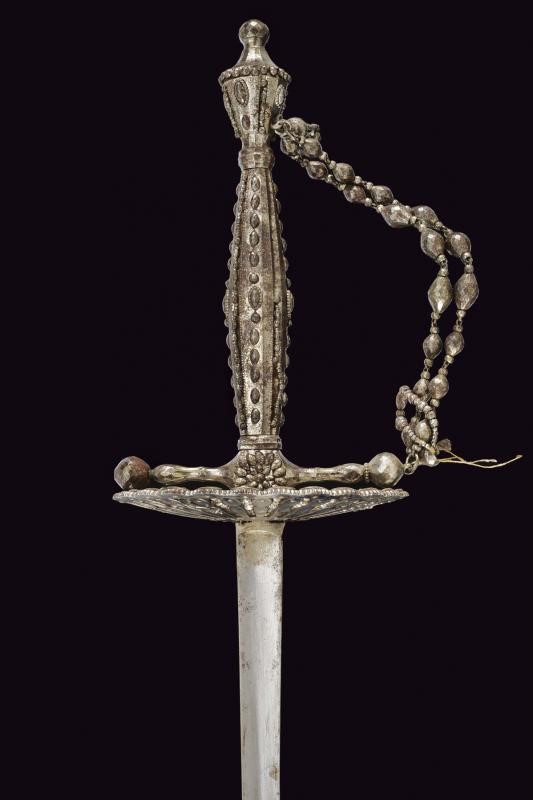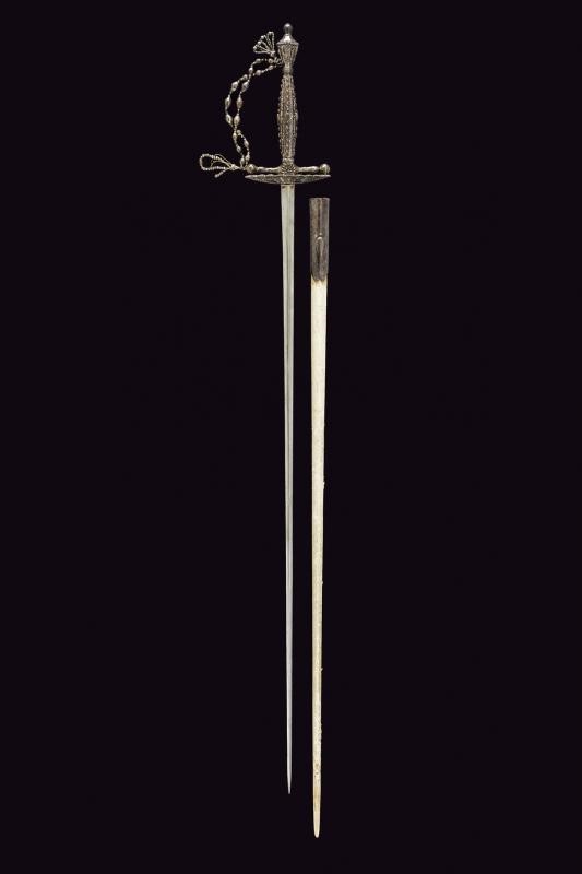 Lama dritta di sezione triangolare a facce incavate. Fornimento di proporzioni leggermente superiori alla norma. Coccia ellittica in ferro, con decoro raggiato e traforato nella quale sono inserite colonnette di perline in ferro diamantato. Il blocchetto con rosetta ad elementi diamantati. Anche i bracci dell'elso e le rispettive teste sempre diamantate. Impugnatura in ferro con cordelline longitudinali (piccole mancanze) ornate en suite, come anche gli altri fregi. Il pomo a urna sempre con perline in ferro diamantato. La bellissima guardia a doppia cordicella di perline in ferro diamantato completa di nappe (con mancanze) lavorate en suite. Fodero in legno con resti di rivestimento laccato color bianco. Conserva solo la cappetta.