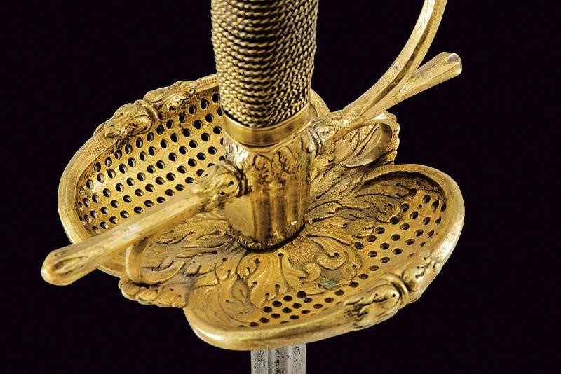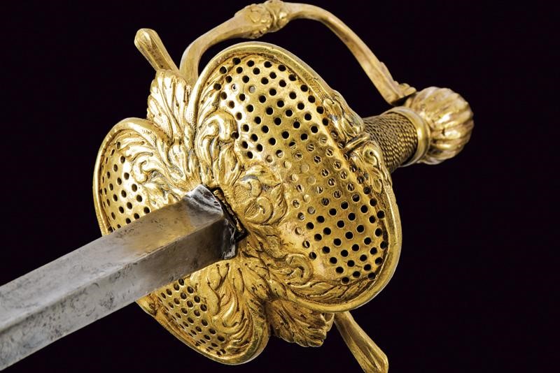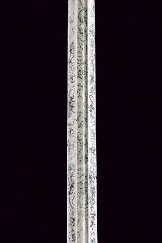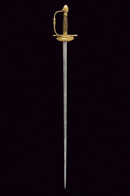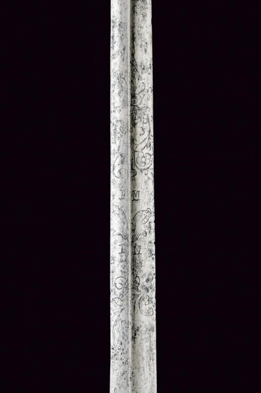 Lama dritta di sezione triangolare con facce incavate, recante alla base resti di incisioni a motivi floreali e con le cifre "PM / IM ". Fornimento in ottone dorato con coccia messa a giorno e decorata con intagli a motivi floreali, cordone lavorato al colmo a motivo vegetale, massello con quattro sgusci longitudinali, bracci dell'elso dritti e teste sagomate, guardia con colmo lavorato en suite alla frontiera della coccia. Pomo ad oliva con sgusci. Impugnatura rivestita da trecciola in filo d'ottone.