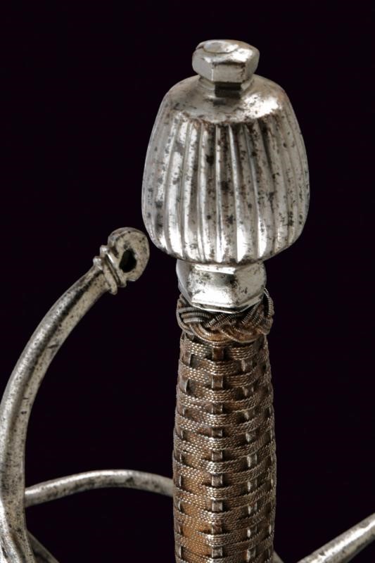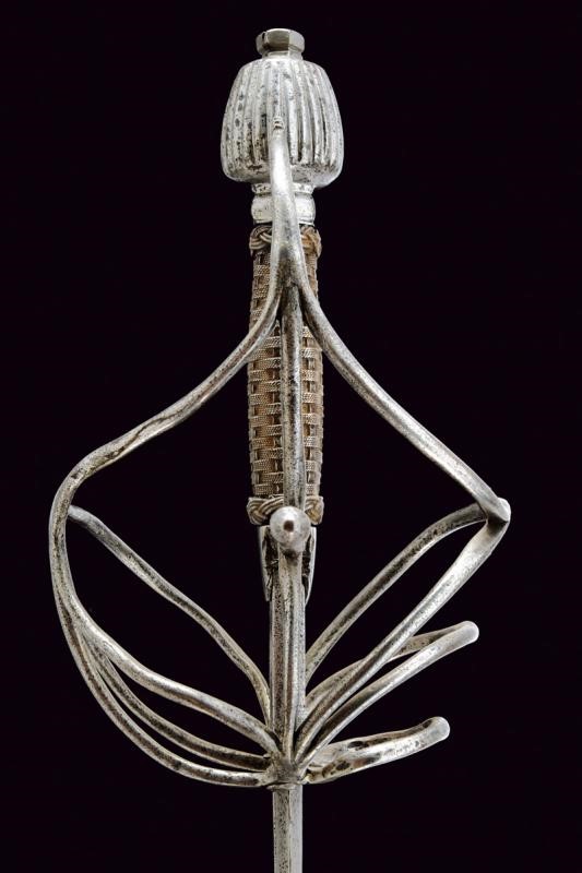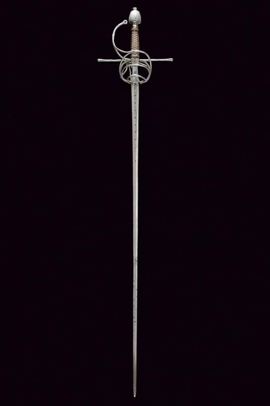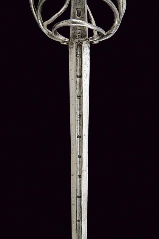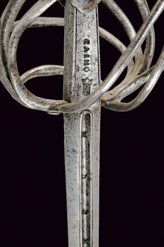 Lunga lama dritta a due fili, di sezione esagonale, con profondo sguscio al forte, recante le marcature "N B D N B D N B D"; ricasso con bella marcatura "CAINO" e punzone "OT" sormontato da corona a tre punte. Fornimento in ferro, elso a bracci dritti con testa sagomata, dagli archetti partono tre ponti; guardia con estremità a mezzaluna, un lato con sguscio semisferico; controguardia a quattro rami. Pomo a tino con scanalature longitudinali, bottone esagonale. Rocchetto costituito da trecciola e teste di moro in filo di ferro. Interessante e bella spada in buone condizioni.