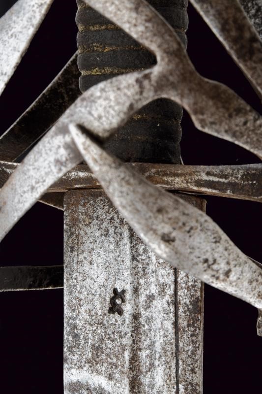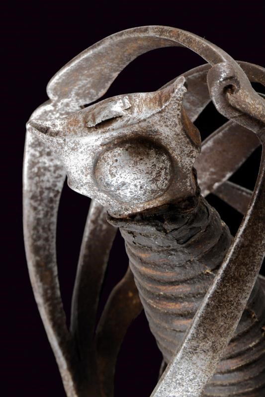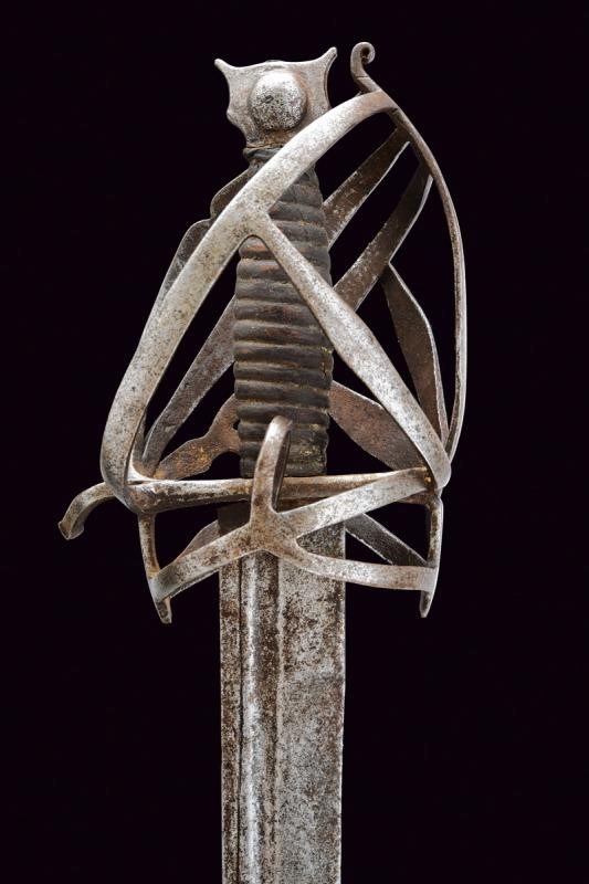 Larga lama dritta a un filo e controfilo con scanalatura e delineatura vicino al dorso. Il tallone con marca veneta su entrambi i lati. Fornimento di forma tipica in ferro a gabbia, ponticello, anello da pollice e pomo a testa di gatto. Impugnatura in legno rivestita di cuoio.