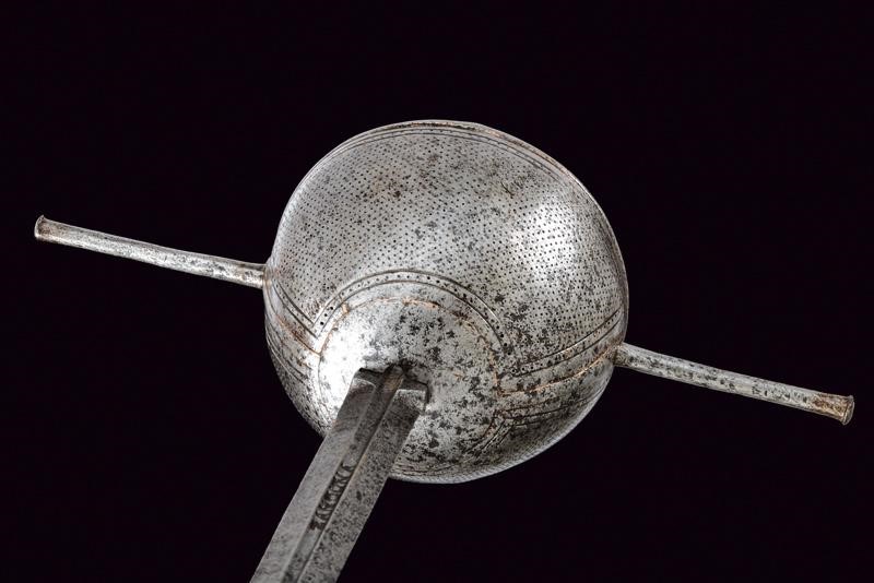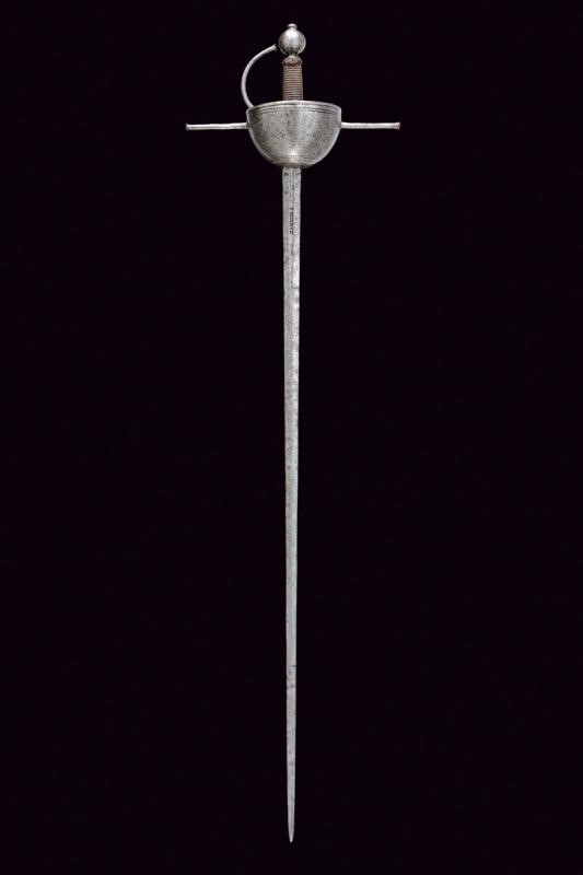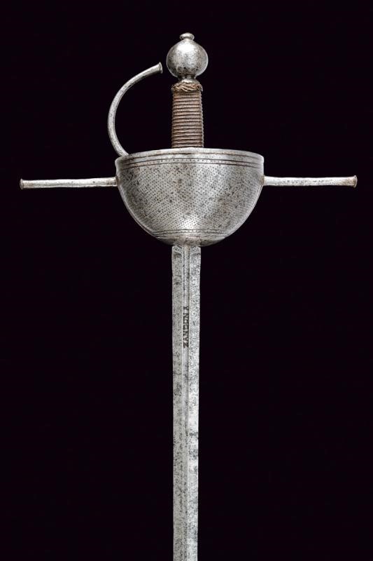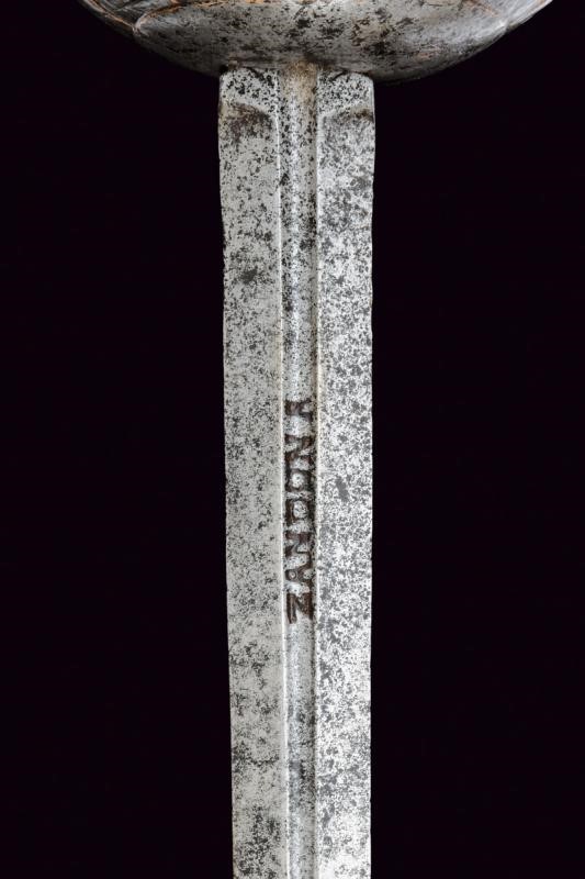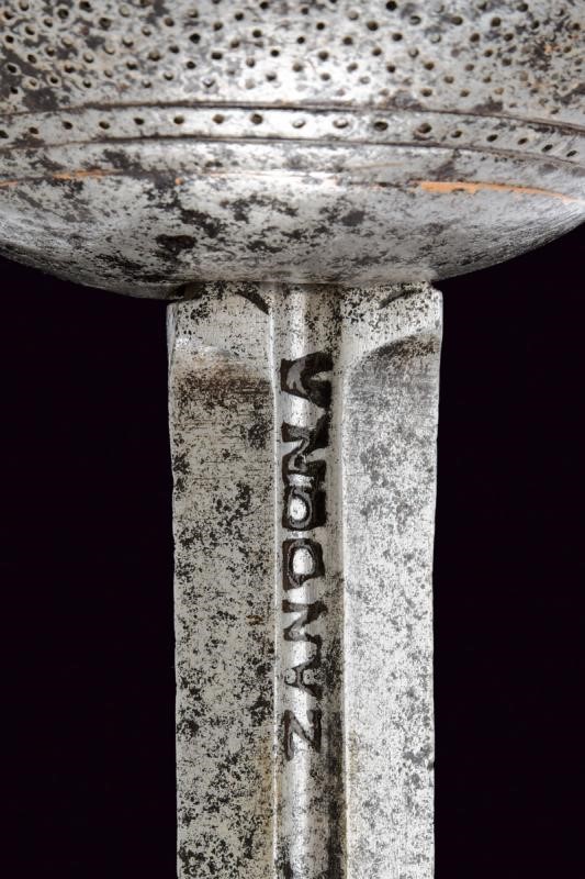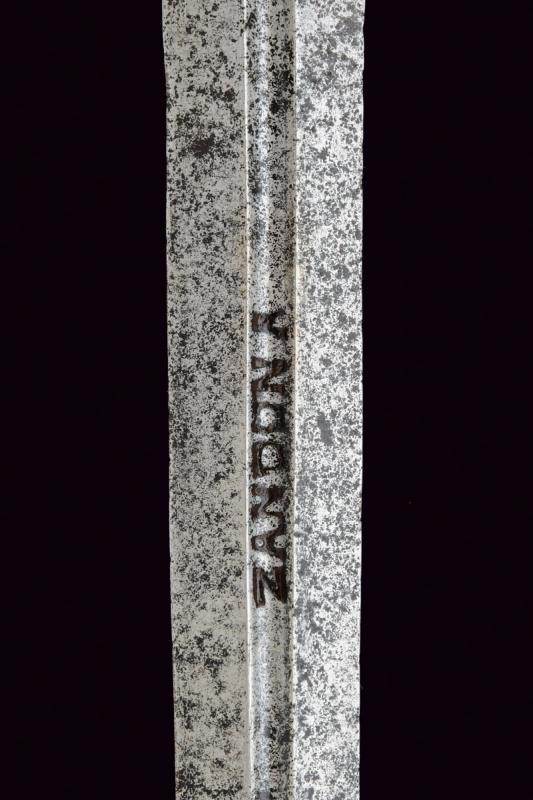 Lama dritta a due fili di sezione esagonale, con sguscio al forte e, su entrambi i lati, la firma "ZANDONA"; ricasso rettangolare sgusciato en suite. Fornimento in ferro con capiente tazza completamente lavorata a puntini traforati; elso dritto di sezione circolare. Pomo sferico bottonato. Impugnatura rivestita con trecciola e dotata di teste di moro in filo di ferro.