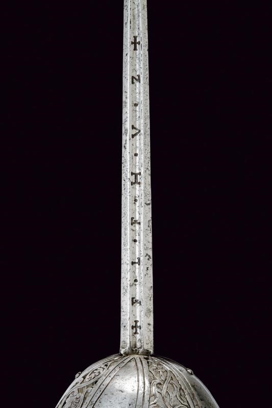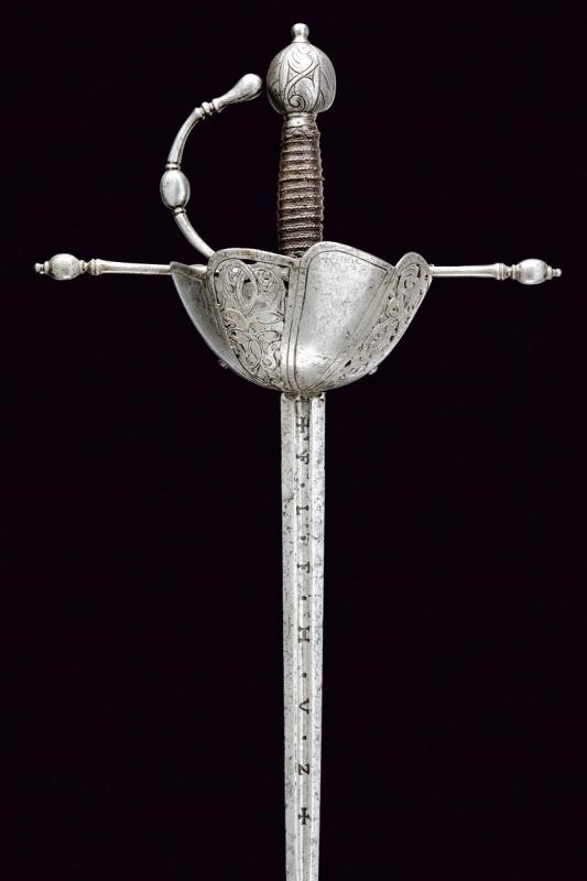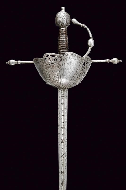 Lama dritta a due fili di sezione esagonale, con profondo e largo sguscio al forte su entrambi i lati, che porta le cifre ben marcate "F L F H V Z" fra croci; ricasso rettangolare inciso con monogramma incorniciato. Fornimento in ferro con ampia coccia lavorata a otto spicchi, alternativamente sodi e messi a giorno, i primi con bordi delineati e i secondi decorati a motivi floreali; bracci dell'elso dritti con testa ben lavorata ad oliva con base a colonna e sommità bottonata; guardia con estremità a goccia. Pomo sferico schiacciato sul piano della lama, superficie intagliata a motivi geometrici. Impugnatura rivestita con trecciola e dotata di teste di moro in filo di ferro.