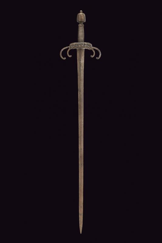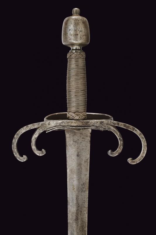 Lama di sezione lenticolare (alcune intaccature, il lato di terza con ruggine superficiale). Fornimento in ferro con due anelli intagliati a linee oblique e con bande longitudinali ai lati, fra questi la coccia, dotata di sgusciature a raggi. Tipici doppi rami dell'elso incurvati verso la lama decorati con brevi sgusci. Pomo troncoconico liscio e bottonato. Impugnatura in legno con trecciola e teste di moro in filo di ferro.