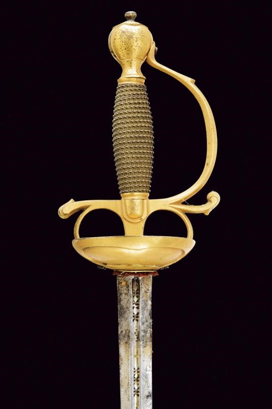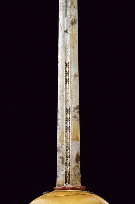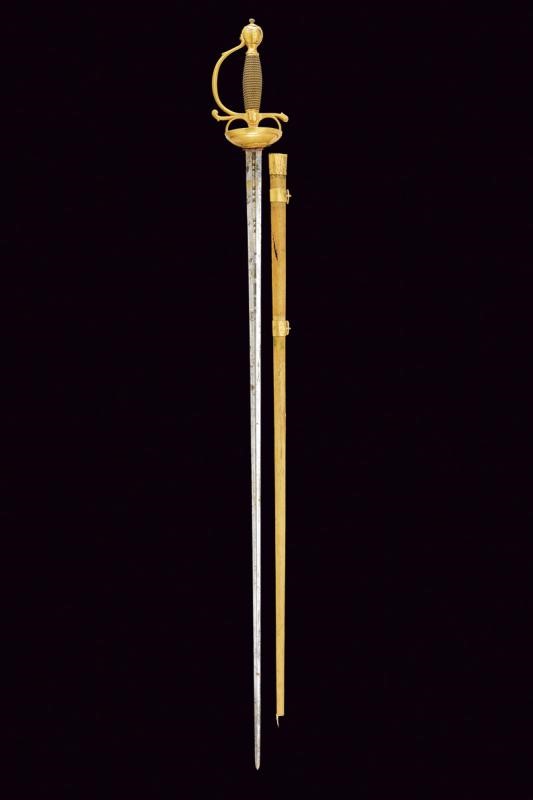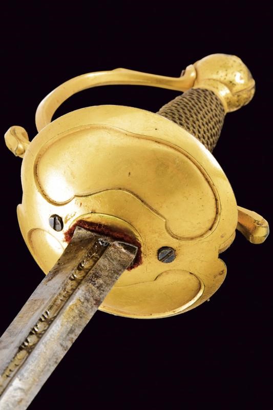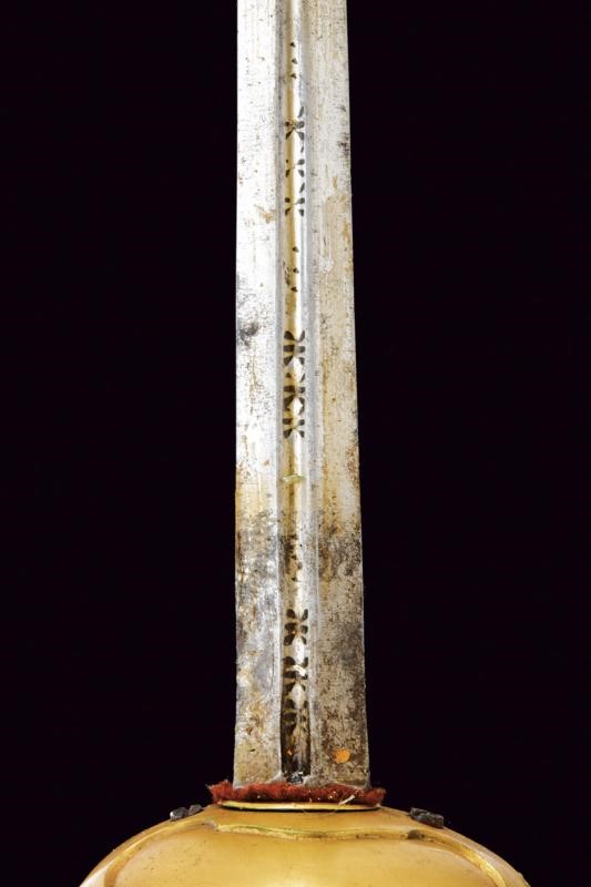 Lama dritta di sezione a losanga, scanalata in mezzeria al forte e recante iscrizioni poi con intagli, in seguito un segmento con intagli piatti. Fornimento in bronzo con doratura al mercurio (al 90%), con coccia circolare, bracci dell'elso e ramo di guardia faccettati, pomo con bande laterali ed impugnatura in legno rivestito di fine trecciola metallica. Completa del raro fodero (segni d'uso e del tempo) in legno rivestito di cuoio, con fornimenti in metallo dorato (il puntale mancante, ristretto, non permette alla lama di entrare completamente) e due anelli di sospensione.