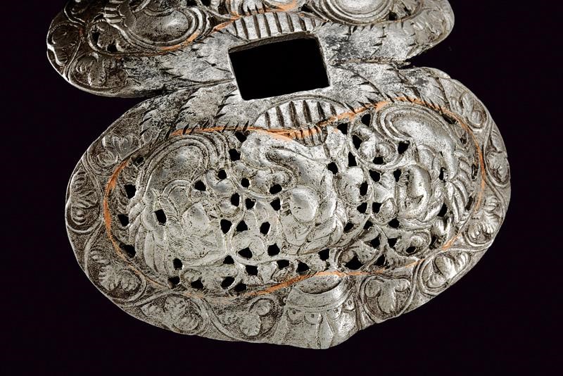 In ferro a due valve messe a giorno; quella anteriore leggermente più grande. Foro rettangolare al centro; la superficie esterna con finissimi intagli in bassorilievo raffiguranti elementi floreali, su ogni valva tre busti, i bordi con rame.