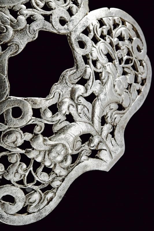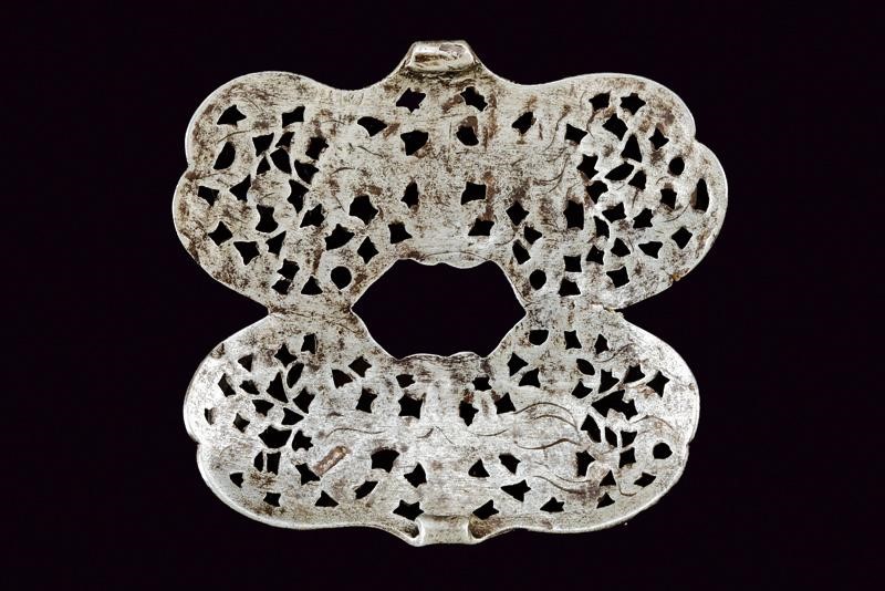 In ferro a due valve messe a giorno; quella anteriore leggermente più grande. Foro esagonale al centro; la superficie con fini incisioni ed intagli a motivi floreali, su ogni valva una coppia di cornucopie specchiate.