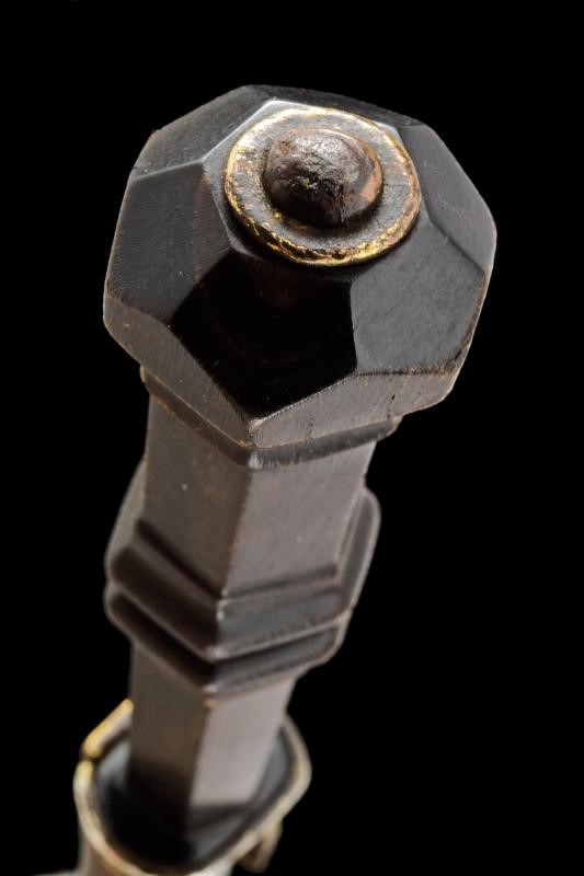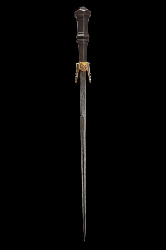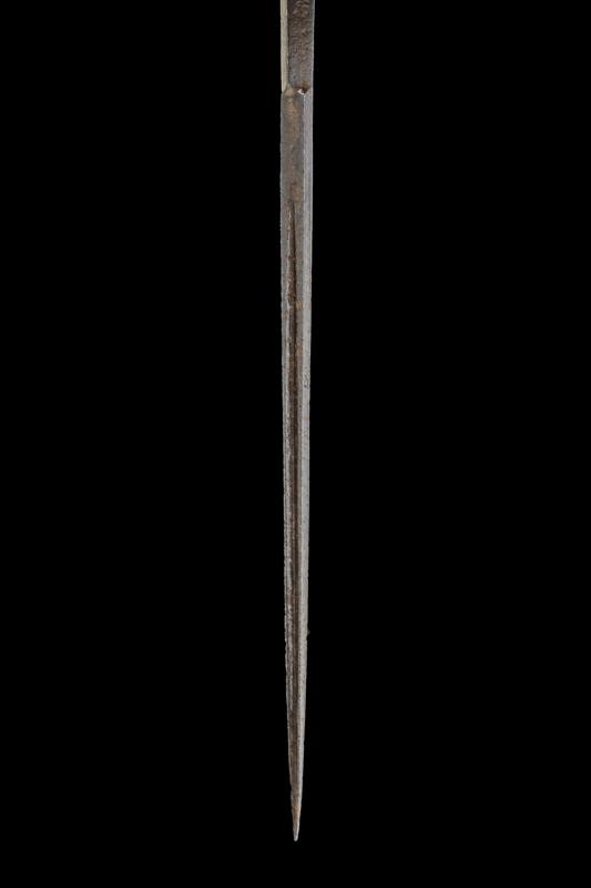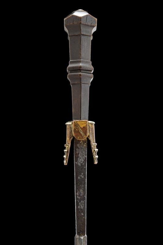 Lunga lama a sezione di losanga, ogni faccia con profonda scanalatura (alcune intaccature); lungo e spesso tallone di sezione rettangolare. Piccolo elso in bronzo dorato (con pochi resti della finitura, circa il 35%) a bracci incurvati verso la lama, entrambi decorati con quattro nervature circolari in argento; la parte centrale, su un lato con stemma, il lato opposto con incisioni puntinate a griglia. Impugnatura in legno lavorata a balaustro e faccettata; pomo di forma esagonale con ghiera superiore in bronzo con resti di doratura.