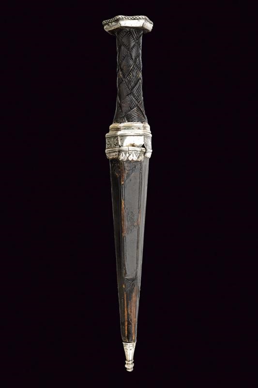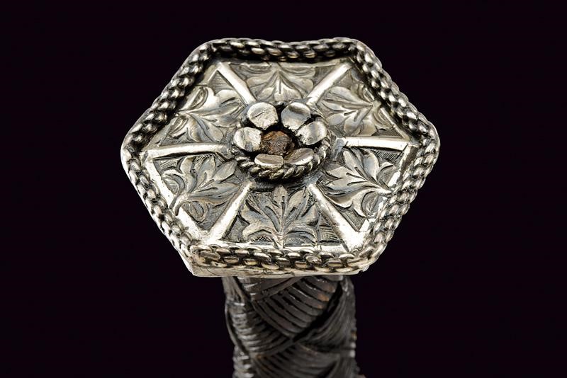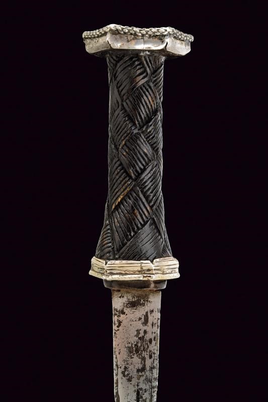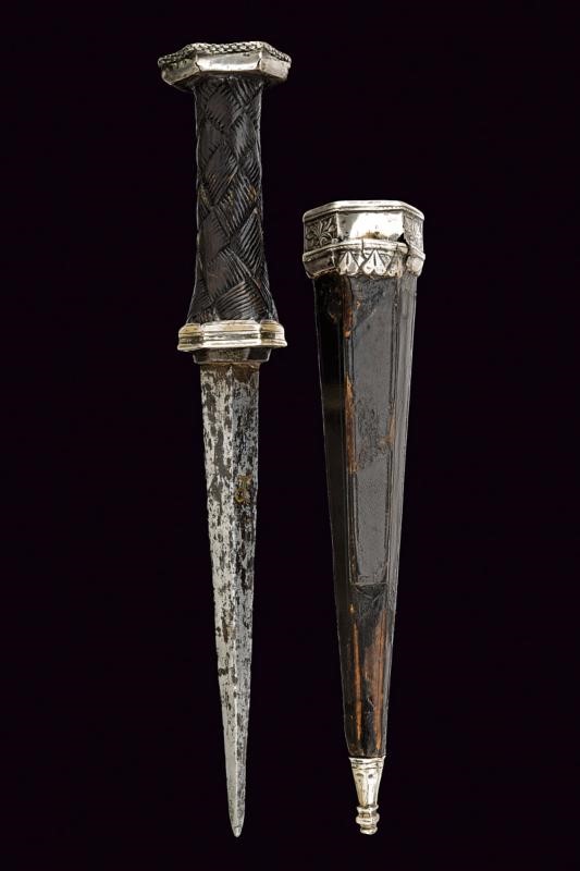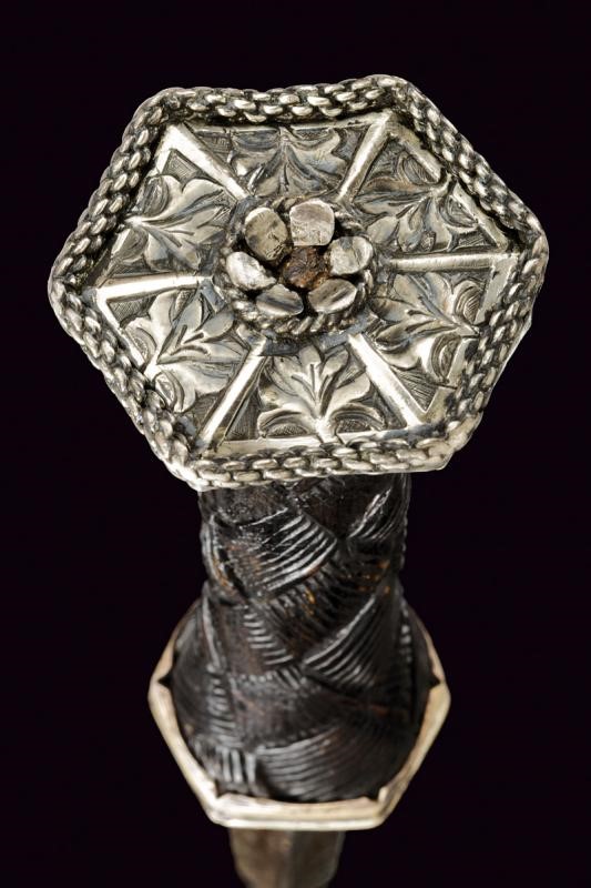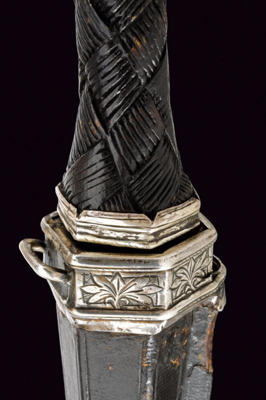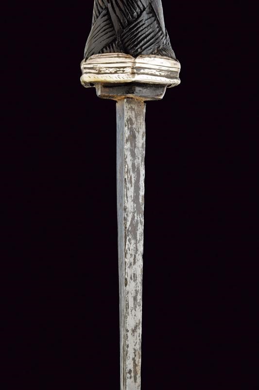 Robusta lama dritta di sezione triangolare a facce piane, una recante marca rimessa in ottone (danni da ruggine). Impugnatura cilindrica in ebano, avente sezione ingrossata alla base inferiore, scolpita ad imitare la trecciola; bel pomo in argento di forma esagonale con bordo lavorato a catena, al centro un fiore e ognuno dei sei settori recante incisioni a motivi floreali; la ghiera sempre in argento e di forma esagonale, decorata con bande. Completo del suo fodero in legno rivestito in cuoio (mancanze) con fornimenti in argento; la cappa presenta alcuni difetti, è incisa en suite al pomo e presenta un passante a staffa; il puntale di forma troncoconica faccettata con base a balaustro; l'imboccatura e l'interno del fodero con resti di velluto rosso. Su un lato scompartimento per coltello, ora mancante.