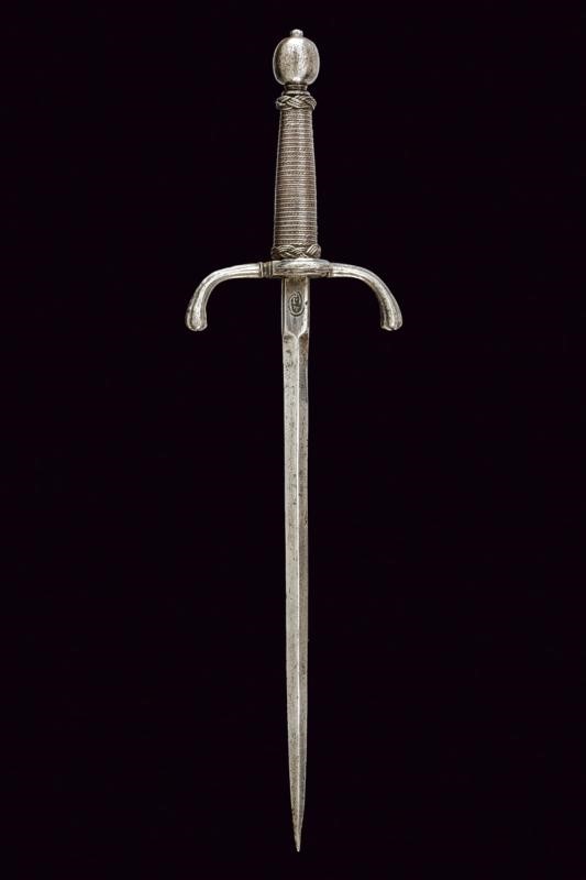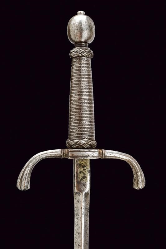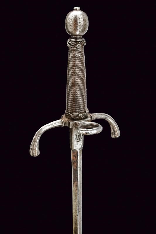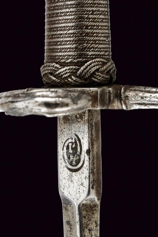 Lama dritta a due fili di sezione a losanga, con spesso tallone recante marca "P.." ovale. Fornimento in ferro con bracci incurvati verso la lama e lavorati a piccole scanalature. Anello di parata strutturato en suite. Pomo sferoide. Impugnatura in legno rivestito da trecciola e con teste di moro in filo di ferro.