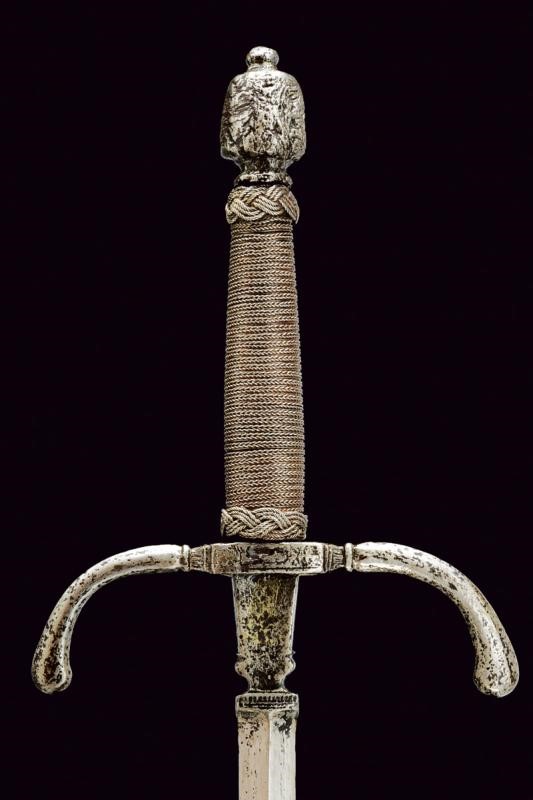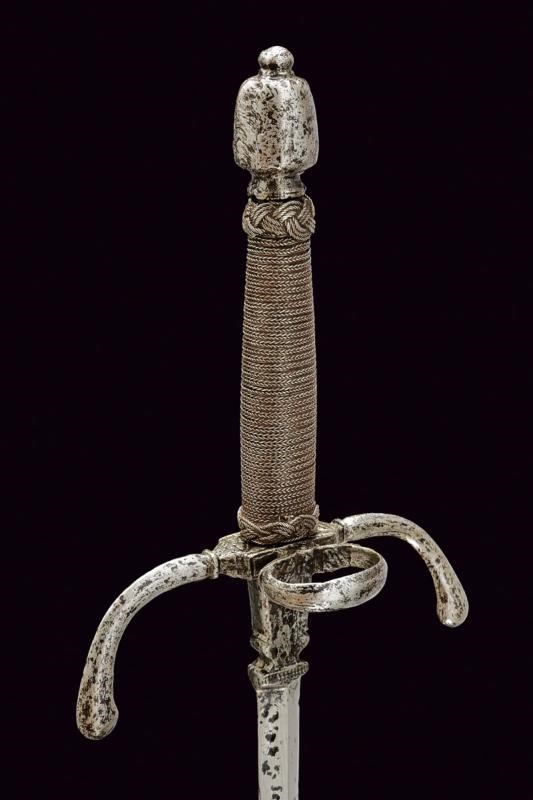 Lama dritta di sezione romboidale, a due fili, la base intagliata a vaso e con resti di punzone. Fornimento in ferro con bracci incurvati verso la lama e con estremità ingrossate. Anello di parata. Pomo a tino faccettato. Impugnatura in legno rivestita con trecciola e teste di moro in filo di ferro.