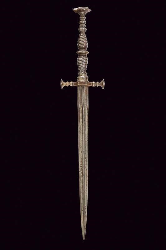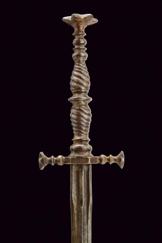 Lama dritta a due fili con forte nervatura centrale, Il tallone con doppia scanalatura. Fornimento in ferro, bracci dell'elso e pomo con estremità a stella. Impugnatura a balaustro.