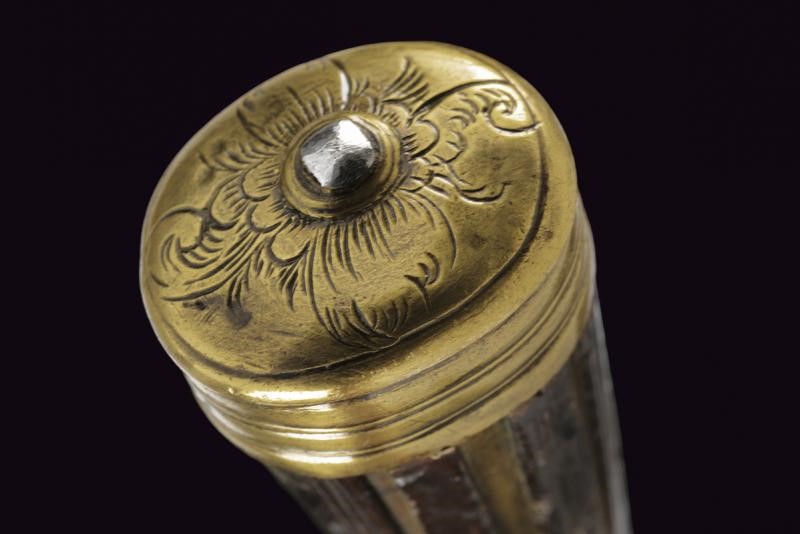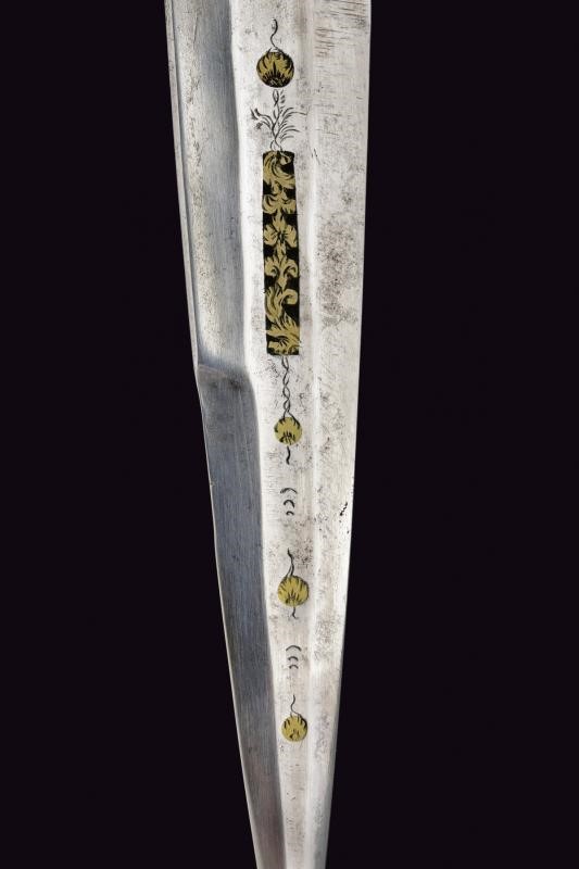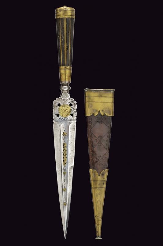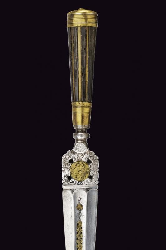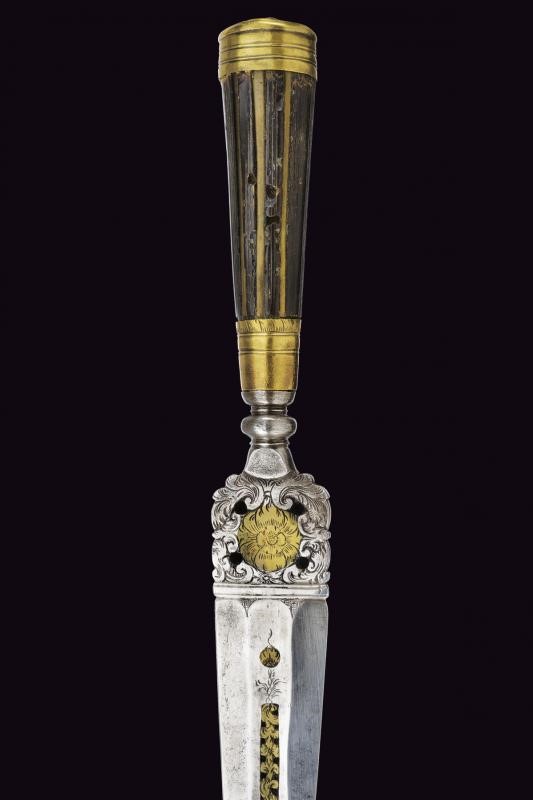 Lama dritta, triangolare, a un filo e controfilo, di sezione esagonale con la facce dorsali incise, parzialmente traforate e rimesse in ottone a motivi floreali; tallone messo a giorno e lavorato en suite. Nodo a disco. Impugnatura in corno (mancanze) con bande longitudinali. Ghiera e cappellotto in ottone. Completo di fodero in cuoio con fornimenti in ottone.