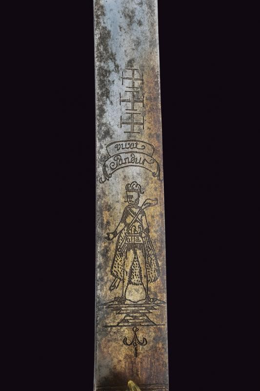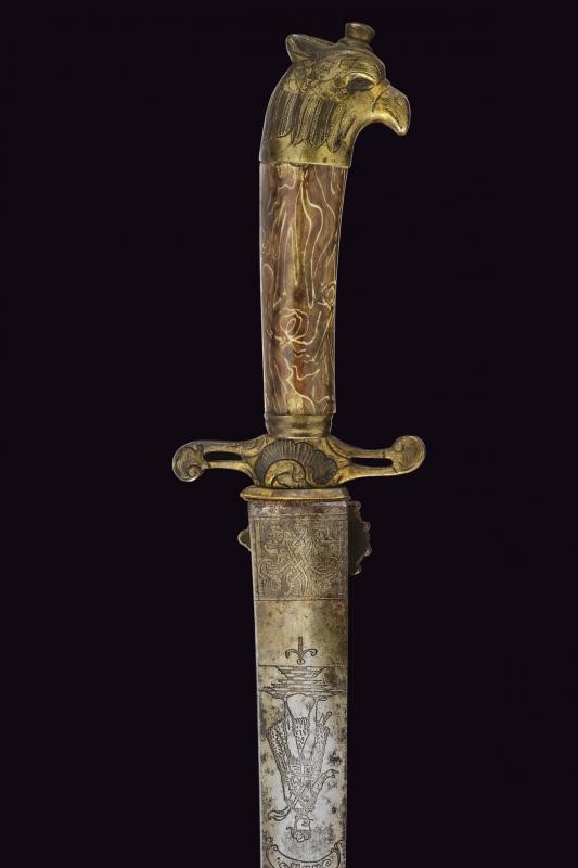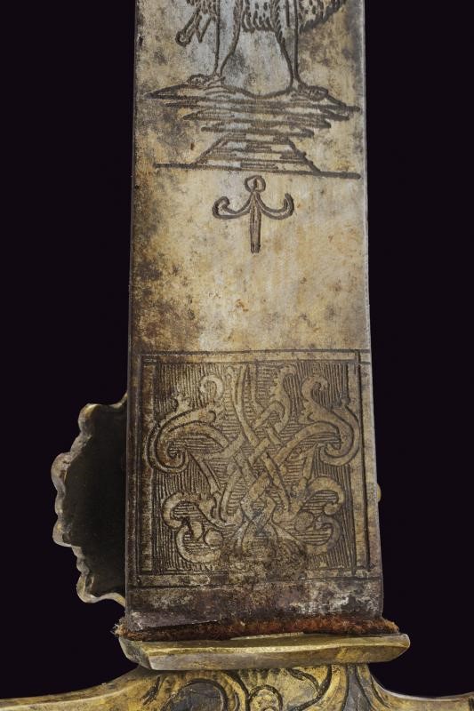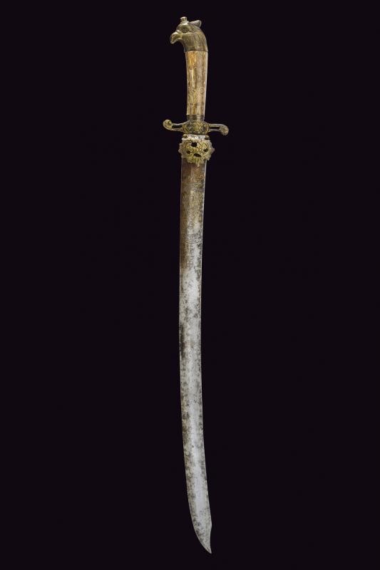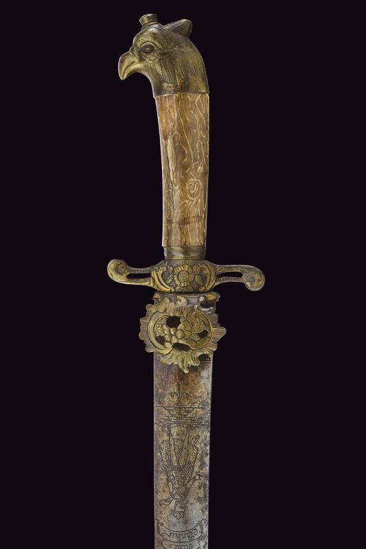 Lama curva a un filo e controfilo, con punta angolata; la base con incisioni effigianti un Pandur, il motto "Viva Pandur" e tre croci. Fornimento in ottone con elementi messi a giorno, pelta con intagli a motivi floreali, massello en suite, elso a bracci controcurvati. Pomo in ottone lavorato a testa d'aquila. Impugnatura in corno (crepe e piccole mancanze).