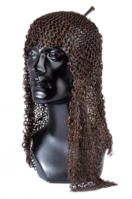 Cuffia composta da anelli in ferro di differente grandezza e ribaditi, piccole mancanze. Alla sommità base circolare con centro bombato e munito di pennacchiera.