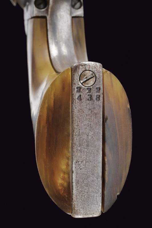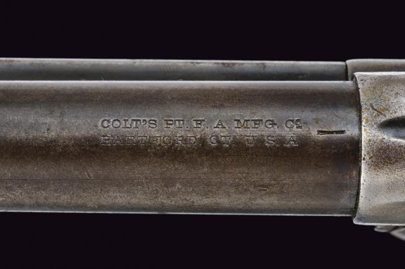 Canna tonda rigata (rigatura visibile, varie incrostazioni all'interno) da 4-3/4", con mirino, marcatura dorsale in due righe "COLT'S PT. F. A. MFG. Co / HARTFORD CT. U.S.A." Cal. 45 (11,4 mm. in volata). Tamburo sgusciato, a sei colpi. Castello con marcatura a due righe con brevetti del 1871 e 1875, marchio del cavallino rampante. Meccanica a singola azione funzionante, quattro scatti, sicura al grilletto funzionante. Estrattore con resti di brunitura (sostituito?) Matricola "222xxx" coeva su castello, ponticello e impugnatura. Produzione tarda. Porosità all'esterno, segni d'uso e del tempo. Guancette in corno di vacca, forse sostituite in epoca d'uso.